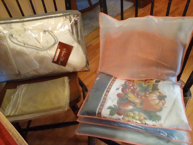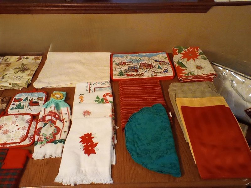 Table Linens, Towels, Pot Holders. Mostly Vintage table cloths (some seasonal) with plastic storage bag; assort hand towels; hand-crocheted pot holders. See photos for quantity and patterns. Furniture seen in photos not incl.