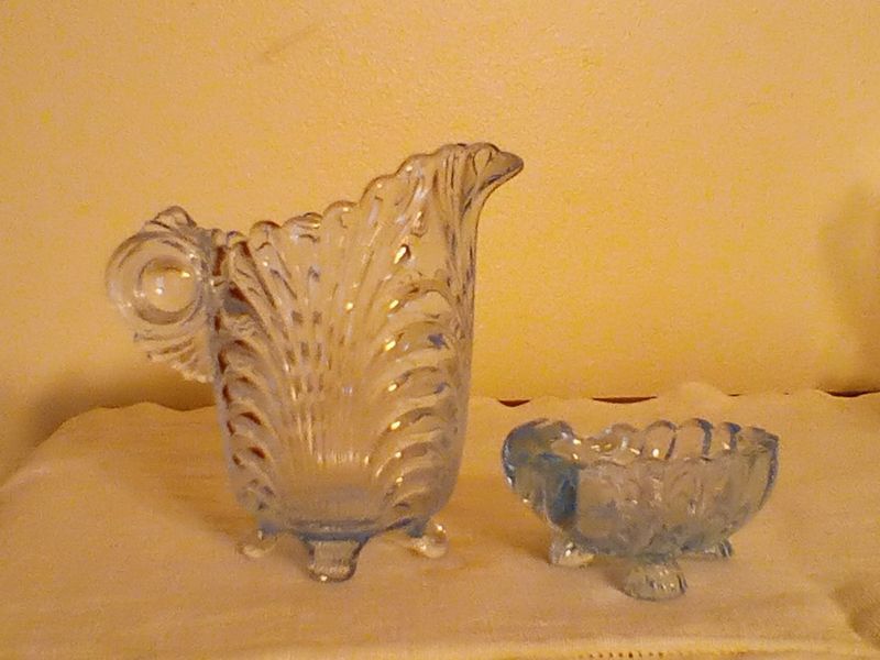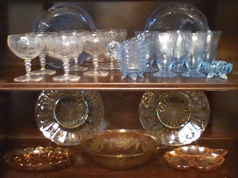 Vintage Colored and Clear Glass Entertaining. Over 30 pieces, incl carnival glass and lg punch bowl with platter; blue depression glasses, creamer; plate; pr scalloped bowls; lg clear glass container; platters; dishes; bowls and more! See photos for details. Furniture incl in lot #10.