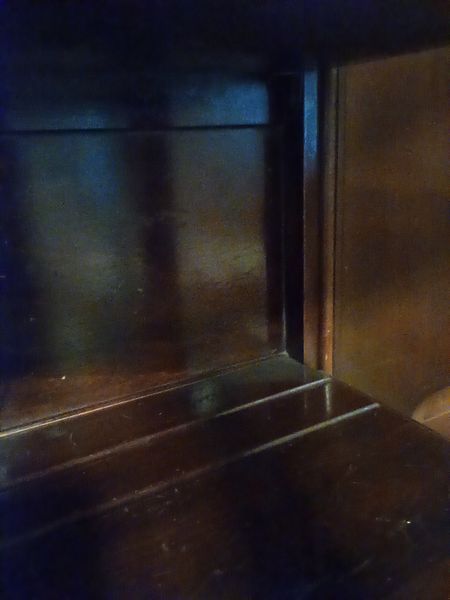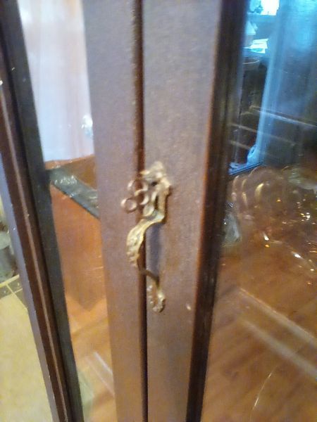 Antique Hutch with Key. Dark stained, double plate grooved glass front & side antique hutch with key to lock. See photos for cond. Contents incl in lot #9.