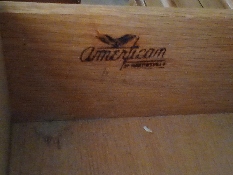 Mid-Century Modern Dresser, Lamp, Mirror, Magazine Rack. Seven dovetailed drawer MCM light wood dresser by American Furniture; blk wall mirror, table lamp & shade; brass mag rack.