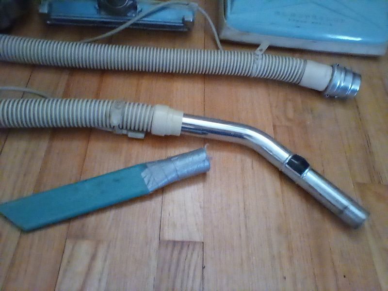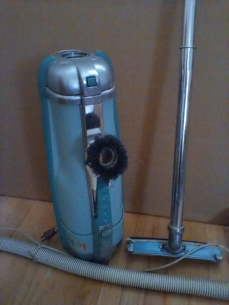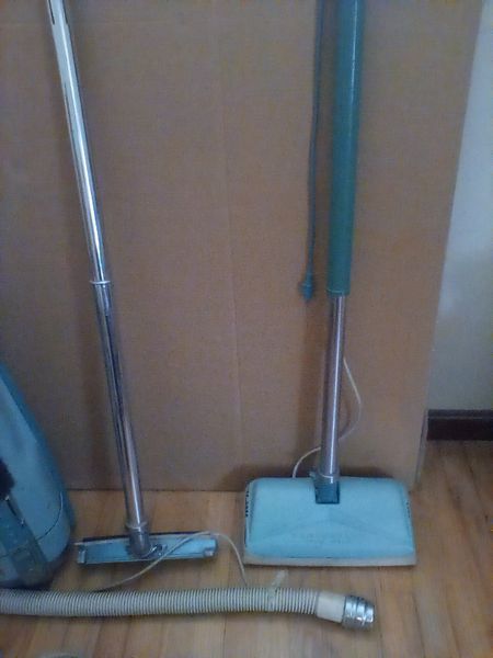 Vintage Electrolux Canister Vacuum. Light blue metal Electrolux canister vac with carpet and other attach.