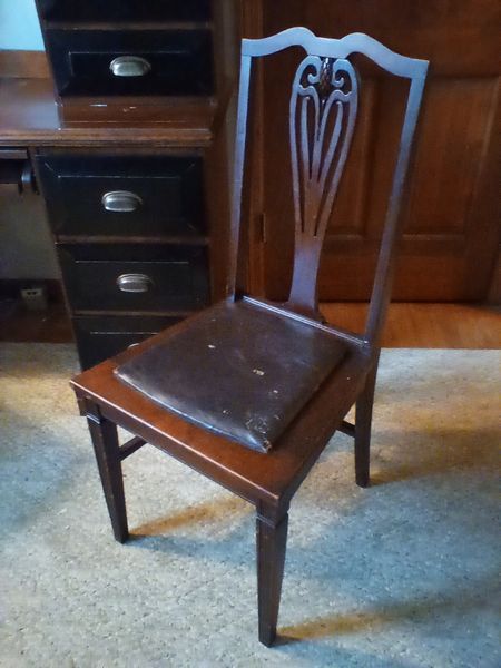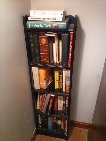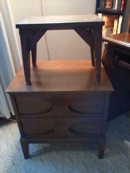 Office Furniture and Books. Modern desk with hutch; Vintage chair; MCM two dovetailed drawer cab; wood foot rest; small wood bookcase with opt books; brass table lamp with oscillating arm; wicker letter storage; wall lamp with textured shade, horse-motif. See photos.