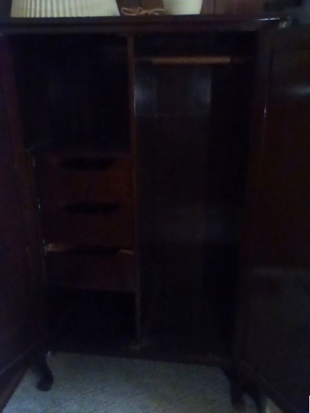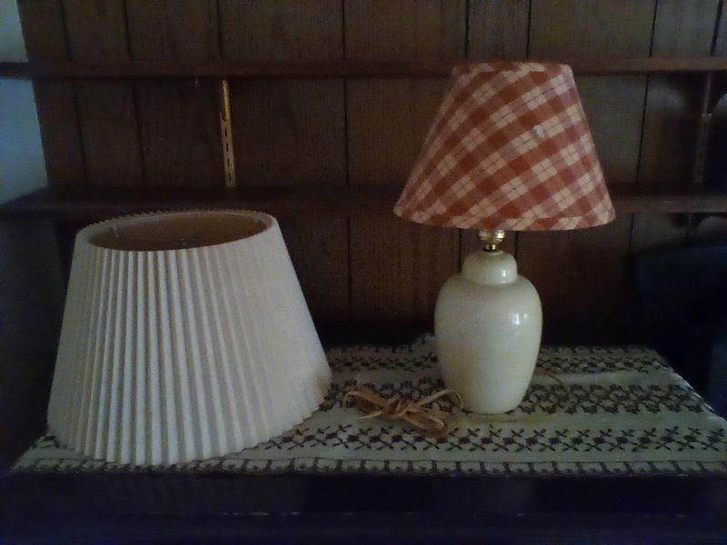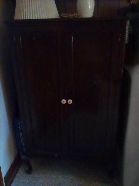 antique Wardrobe Cabinet, Lamp, Dark stained antique wardrobe cab with drawer storage & clothing bar, white porcelain knobs; country-style tannle lamp; extra pleated shade.