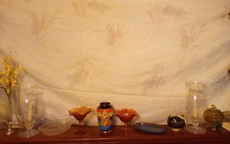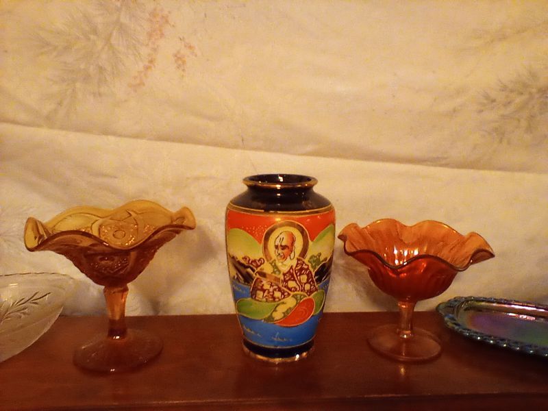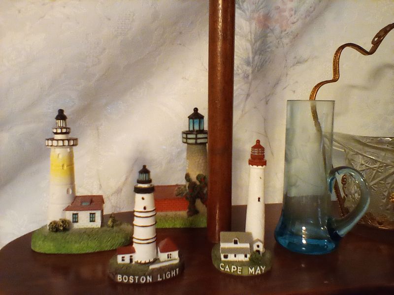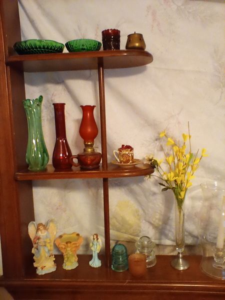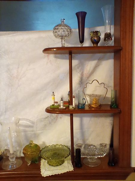 Vintage Entertaining, featuring Colored Glass. Approx 3-doz items, incl: two insulators; mini lighthouse décor; colored glass pedestal dishes; vases; statues; covered dish; plates; bowls. See photos for more details.