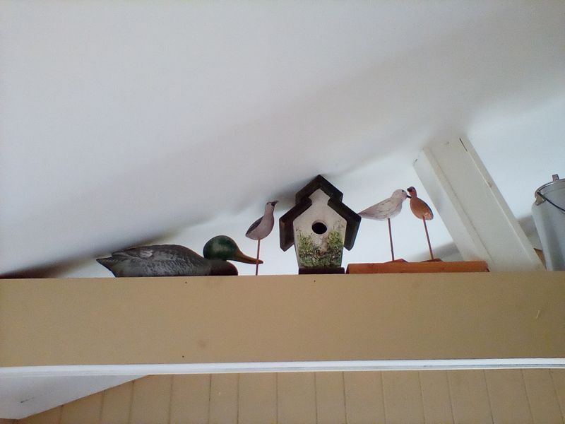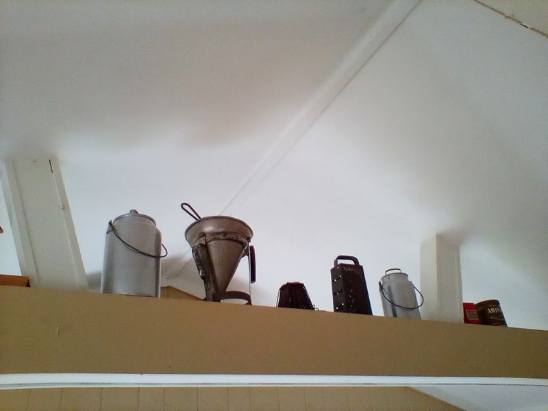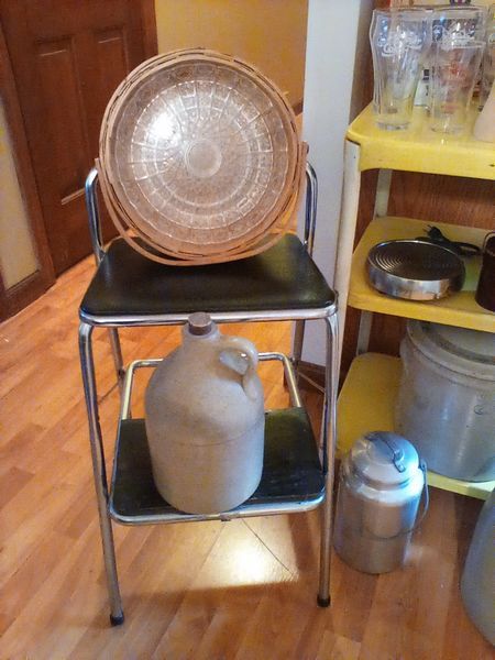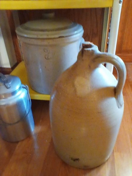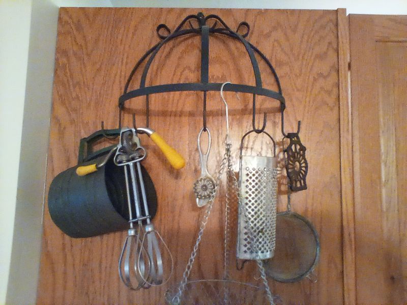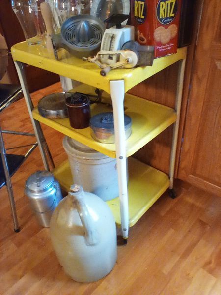Kitchen antiques, featuring Crocks. Vintage & antique kitchen gadgets; pot rack; metal rolling table; step stool; crocks (var sizes); bird house décor; sifter; other related items as seen in photos.