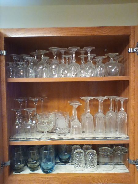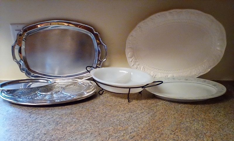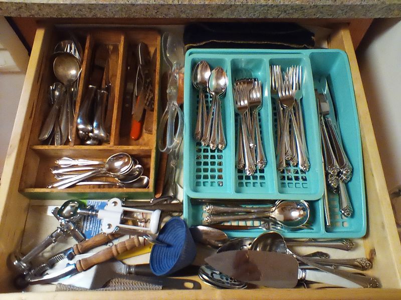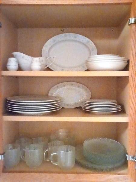 Glassware, Dishes, Platters, Flatware. Crystal stemware; Vintage glasses; "English Garden" dish set (incomplete); four platters; milk glass server; flatware & utensils as seen in drawer.
