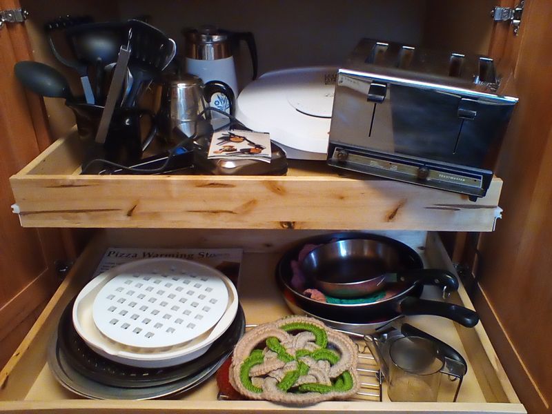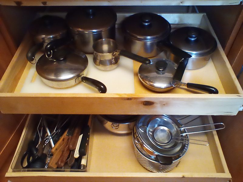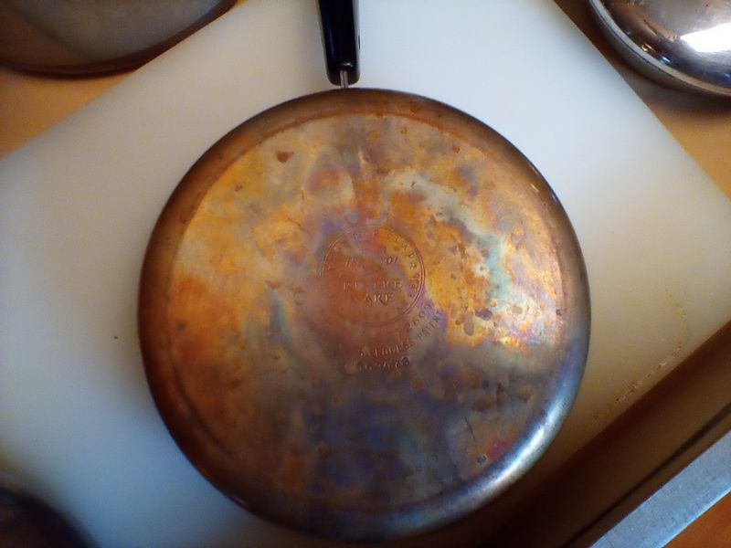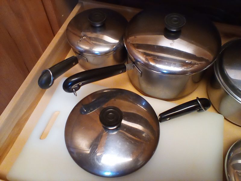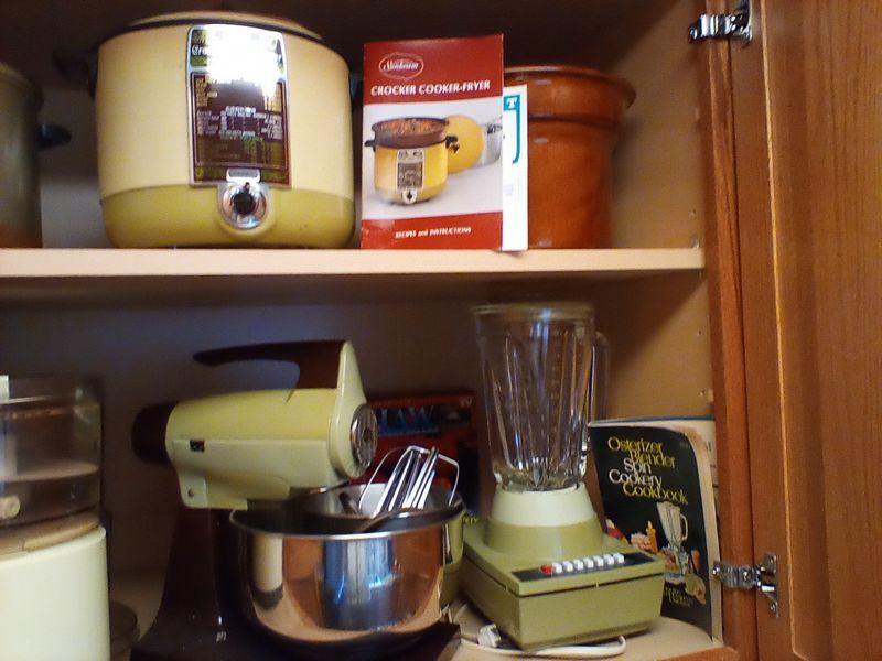 Counter Appliances. Vany Vintage countertop appl incl: 3-piece Crocker cooker/fryer with manual; La Machine II food chopper; avocado gr standing mixer with bowl & attach; avocado gr blender; four-slice SS toaster assort pots, pans, lids, feat Revere; knives, utensils; more! See photos for additional items.