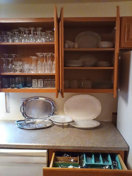 Glassware, Dishes, Platters, Flatware. Crystal stemware; Vintage glasses; "English Garden" dish set (incomplete); four platters; milk glass server; flatware & utensils as seen in drawer.
