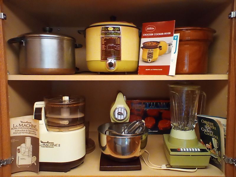 Counter Appliances. Vany Vintage countertop appl incl: 3-piece Crocker cooker/fryer with manual; La Machine II food chopper; avocado gr standing mixer with bowl & attach; avocado gr blender; four-slice SS toaster assort pots, pans, lids, feat Revere; knives, utensils; more! See photos for additional items.