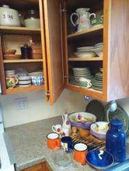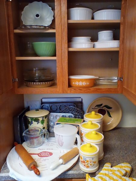 Kitchen Bakeware and Ceramics. Corning & Pyrex bakers; covered canister sets; measuring cups and Betty Crocker mat; muffin pans; cooking racks; utensils as seen in two drawers; more! See photos.