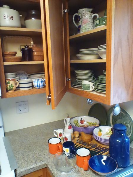 Colorful Kitchen, featuring Vintage Green Colonial Homestead Dish Set. Gr underglaze Colonial Homestead dish set (see photos); US ovenware covered crocks; pitchers; platters; bowls; crocks; mugs; modern hand-crafted salad set; Vintage flatware. See photos for qty and additional items.