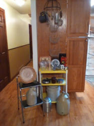 Kitchen antiques, featuring Crocks. Vintage & antique kitchen gadgets; pot rack; metal rolling table; step stool; crocks (var sizes); bird house décor; sifter; other related items as seen in photos.