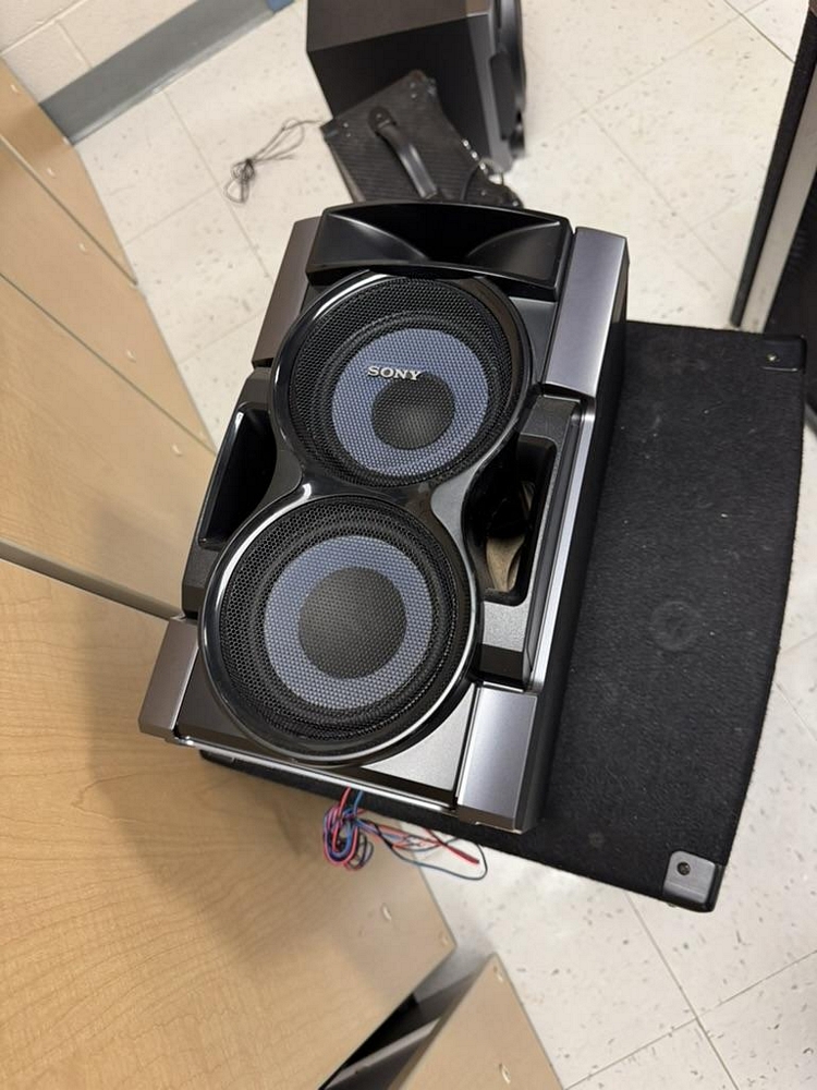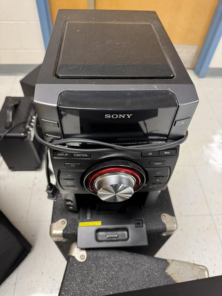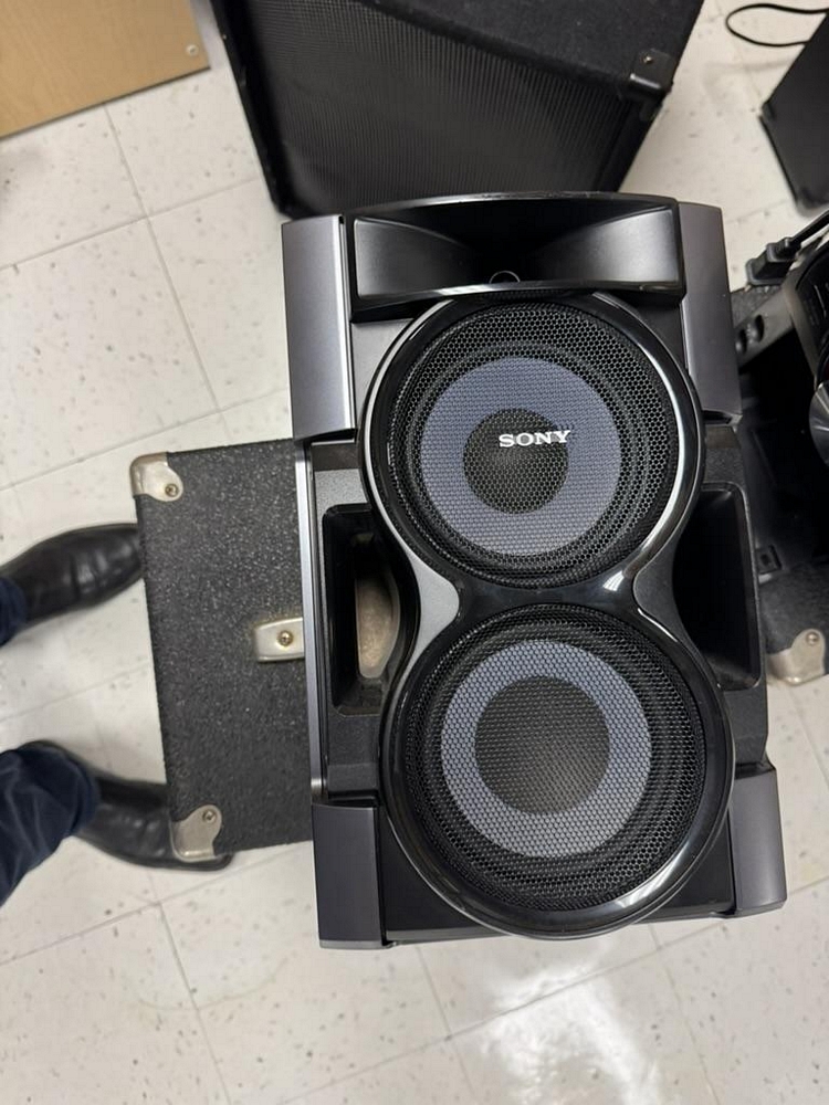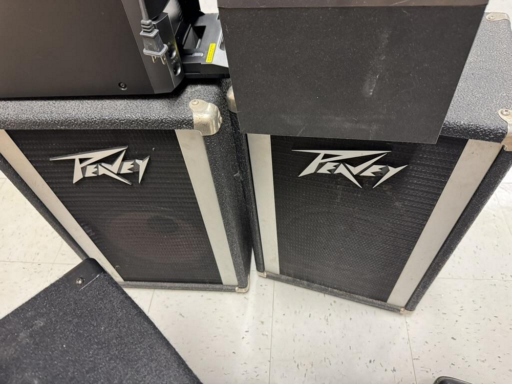 Audio items including Rockville Monitor Speaker, Sony Stereo, Peavey monitors, Marshall amplifier. Also includes IBIVIC Saxophone Case.