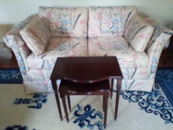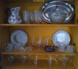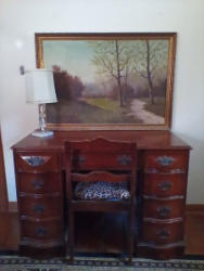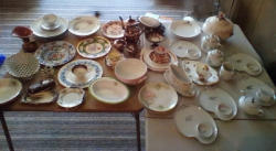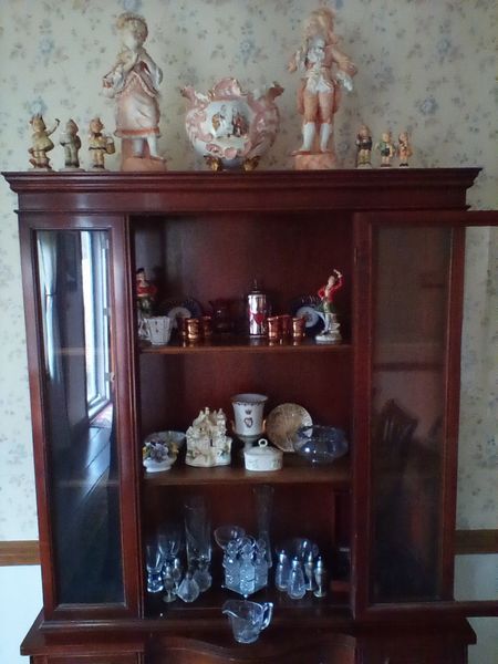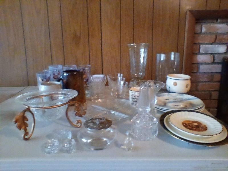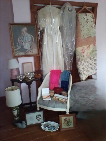 Items include Roseville/Wedgwood/ Spode quality entertaining pieces; Lance Decorators barrel chair; propane & electric heaters; sleeper sofa; wedding dress & veil; pewter pitcher; Longaberger baskets; Honda four stroke BF2D boat motor; antique mahogany desk; glass front China cabinet; MCM bedroom furniture; blue depression glass; vintage watches; bar entertaining pieces; Schwin exercise bike; mini accordion in box; vintage cameras; cast iron stove; floor lamps; area rug & more. Items are located in Collinsville, CT.