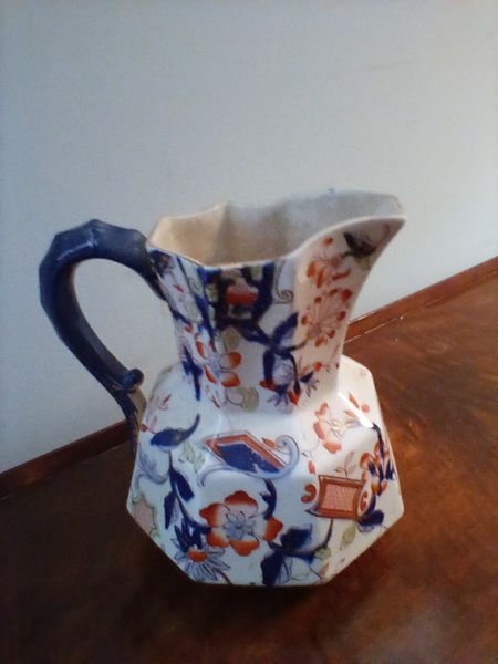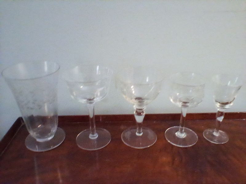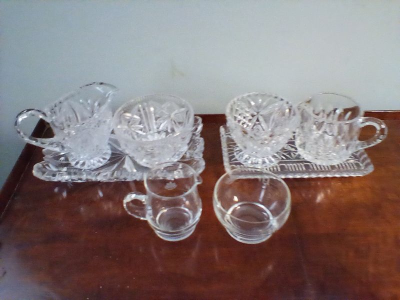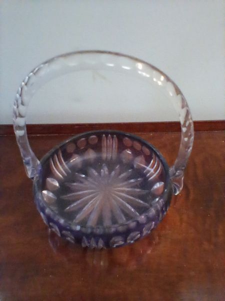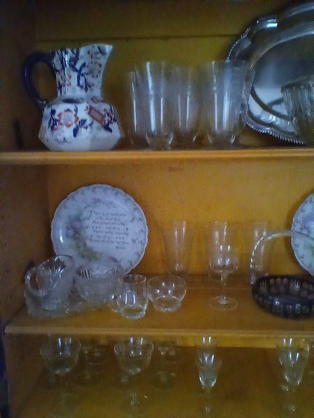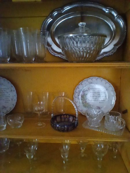 Vintage Formal Entertaining. including silver plate platter; antique pitcher (see hallmark); purple handle crystal basket; crystal glassware (five styles-see photo); creamer & sugar sets with trays; covered bowl; collector's plates. Cabinet seen in photo incl in lot #2.