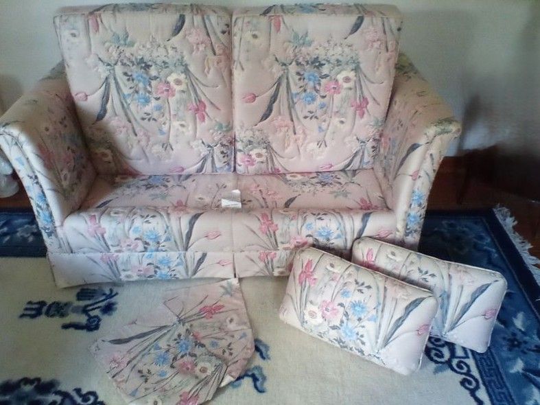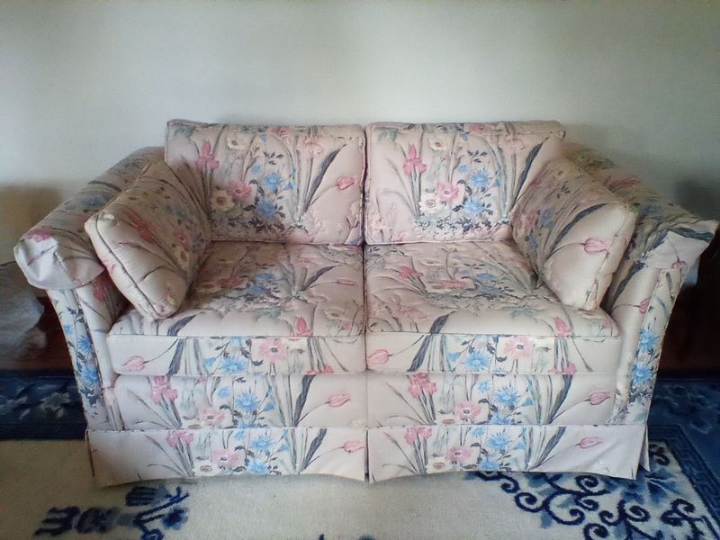 Loveseat Sofa, Nesting Tables. Arcadian Furniture Co. 5' loveseat sofa x26"Dx27"H; set of 2 wood nesting tables, larger 22"Wx13'Dx20"H. Rug seen in photos not included