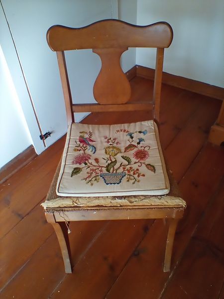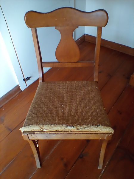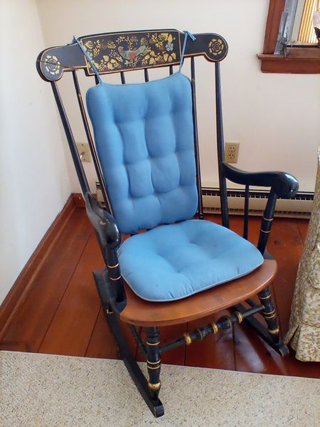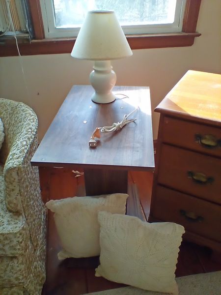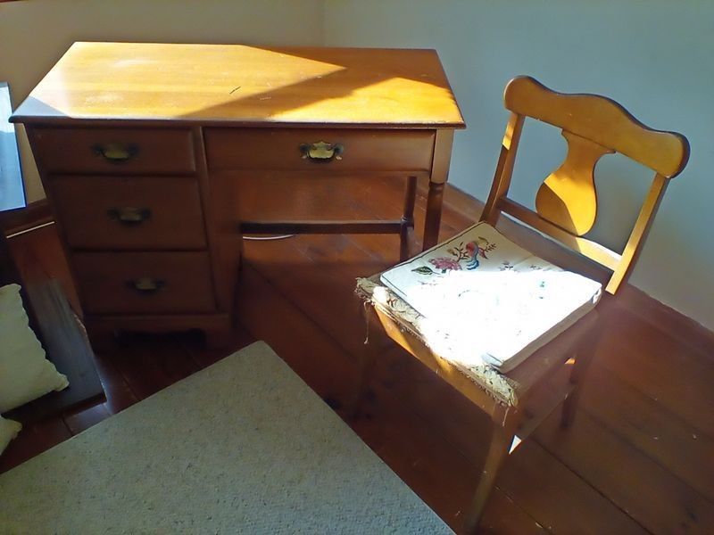 Furniture, Area Rug. Buyer's Choice: rocking chair; barrel chair (matches lot #1); student desk with four dovetailed-drawers, 39"Wx19"Dx29"H; side chair; lamp table; large nylon area rug; throw pillow; small table lamp. See photos for conditon. Located on the second floor & in basement.