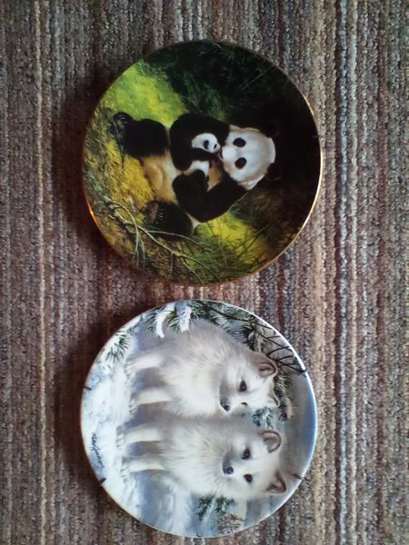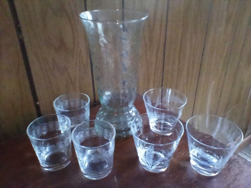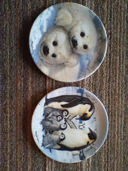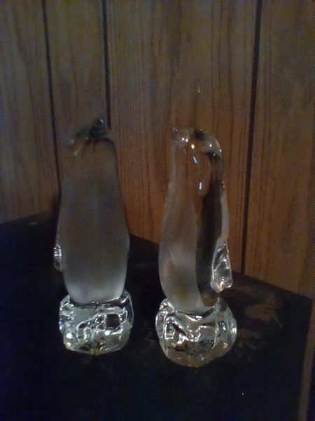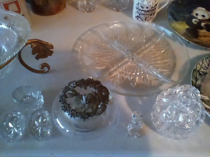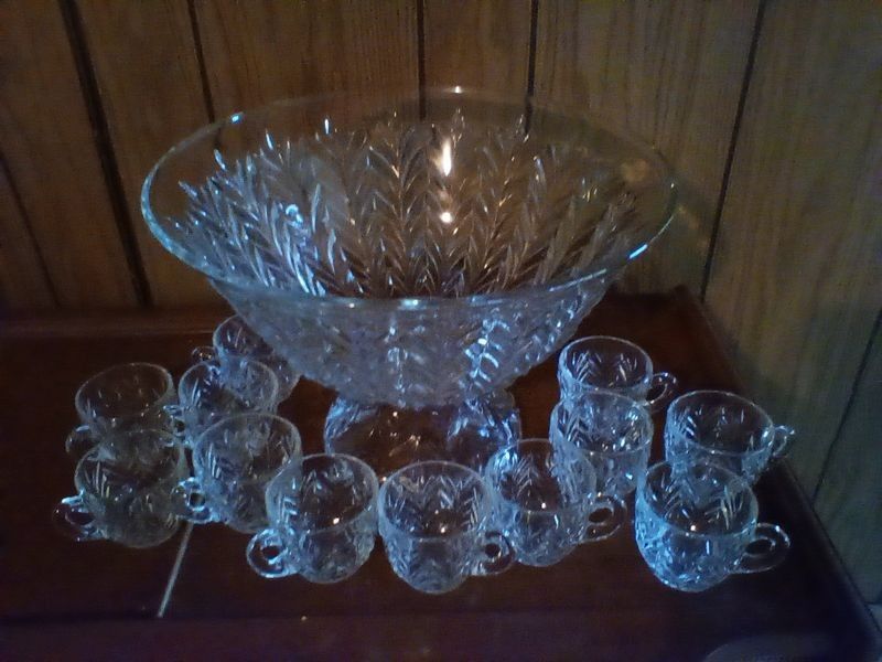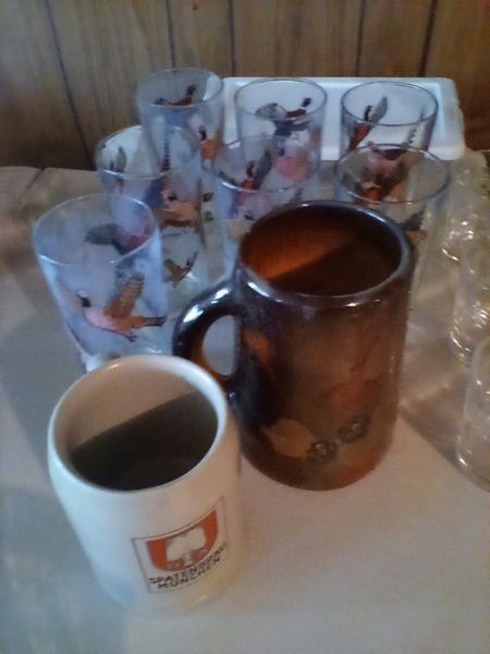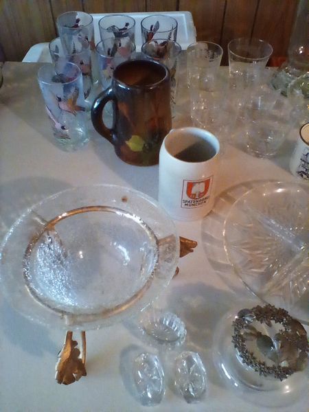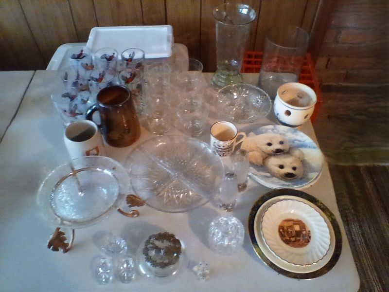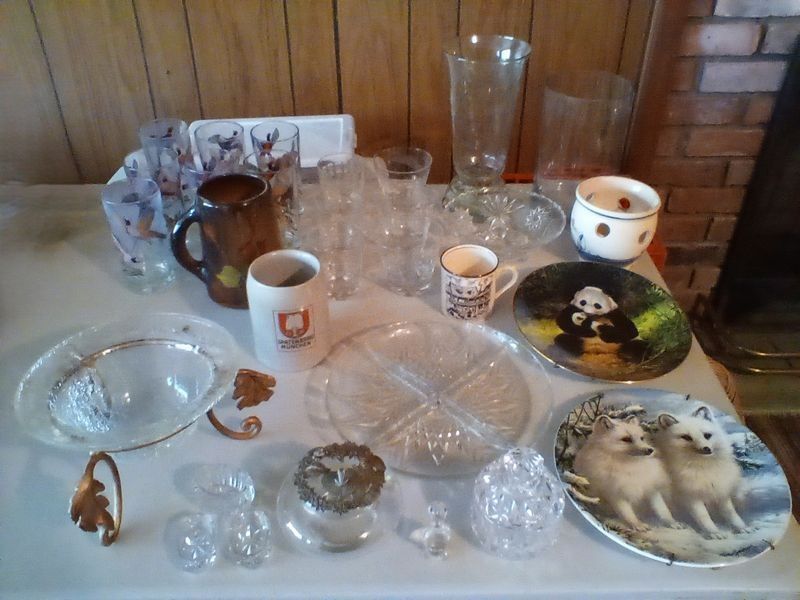 Bar Entertaining and Punch Bowl. Inc; glasses; mugs; collector's plates; serving dishes; pr crystal penguins statues; Vintage 14-pc bunch bowl (no ladle) with 12 punch cups; six collector's plates (see photos); Vintage glasses; pewter pitcher. Located in the basement.