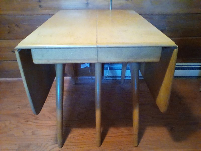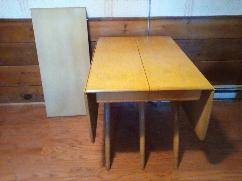 Drop Leaf Gate Leg Kitchen Table. Vintage light wood kitchen drop leaf table with gate leg-style pedestal base, 58"Lx40"W open & lg 18"W table insert (different coloration due to sun fading). See photos for table const.