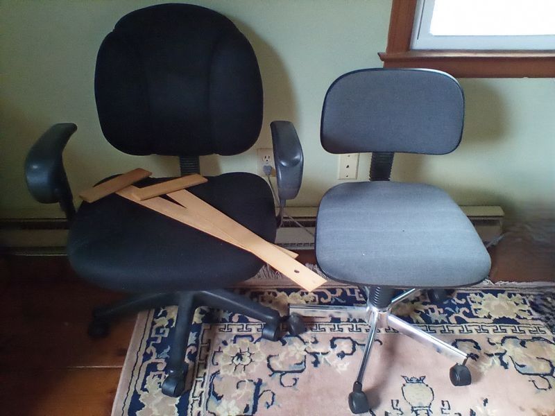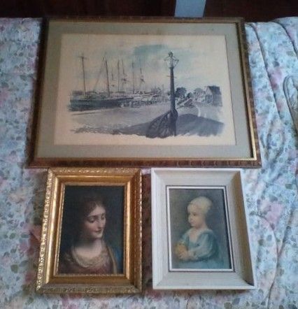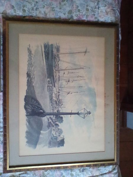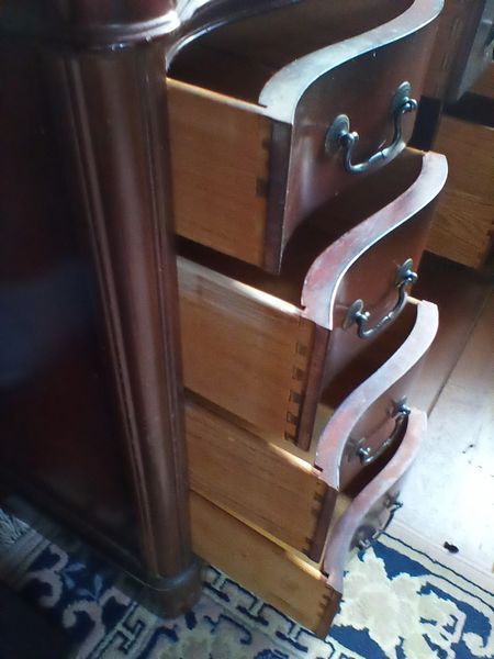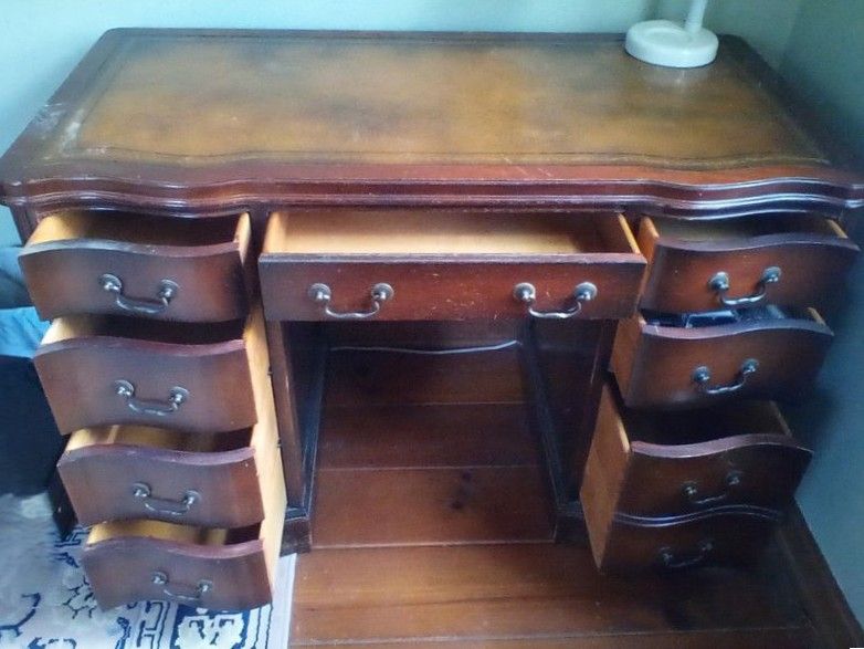 Vintage Desk, Chairs, Lamp, Art. Vintage bowed front eight dovetailed-drawer desk; two desk chairs on wheels; T-squares; desk lamp; framed wall art. See photos. Rug seen in photos not included.