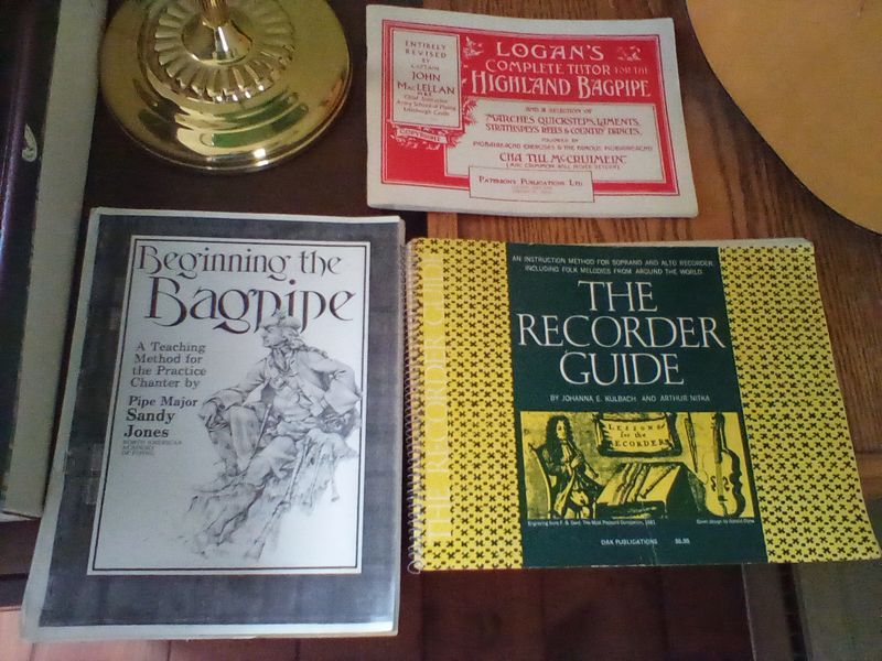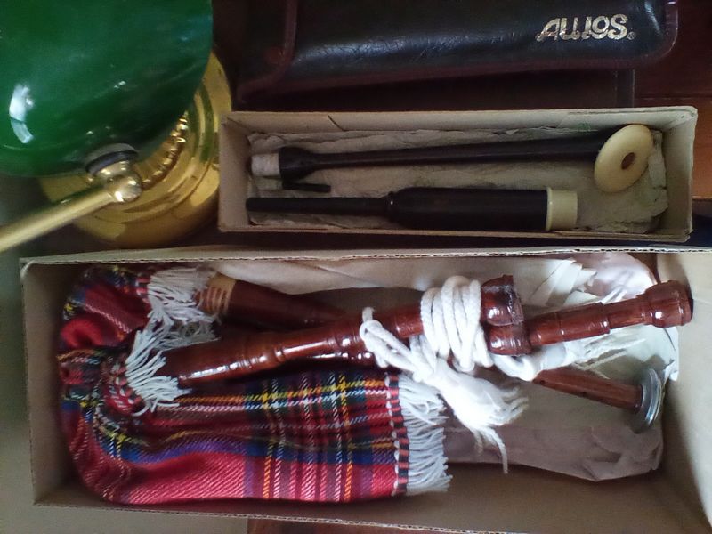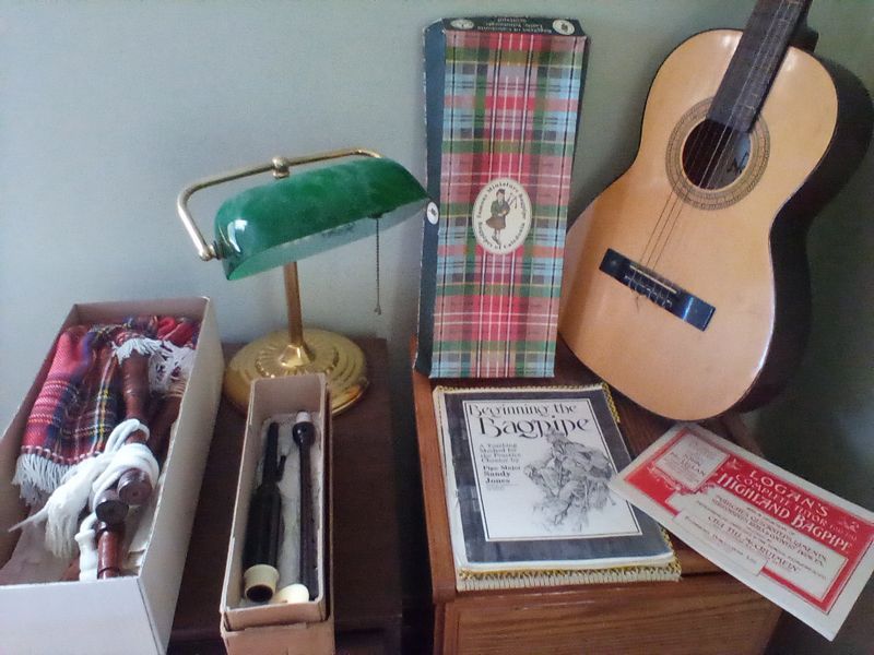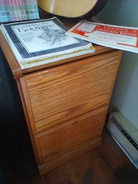 Musical Instruments, File Cabinet. Instruments including mini accordion (in box); recorder; music books; gr glass desk lamp; guitar; two-drawer wood file cab; fringed wool blanket. See photos for more details.