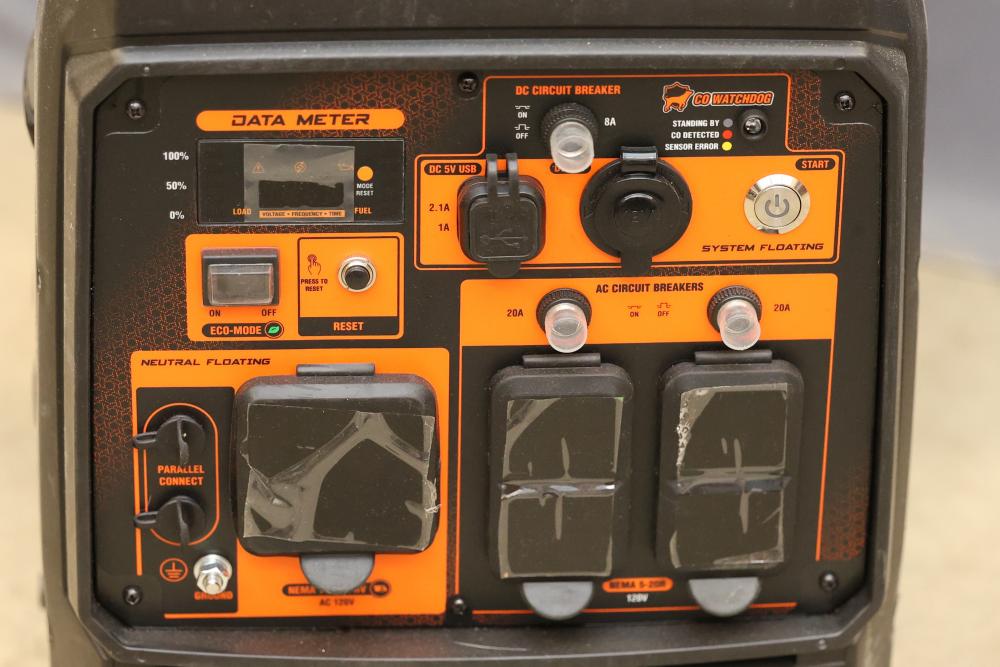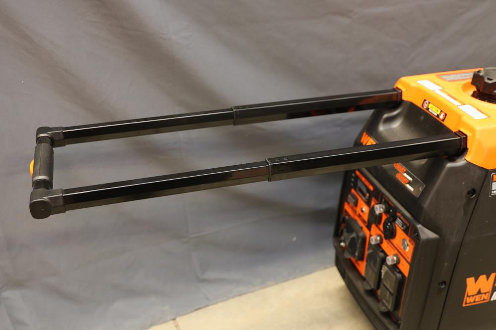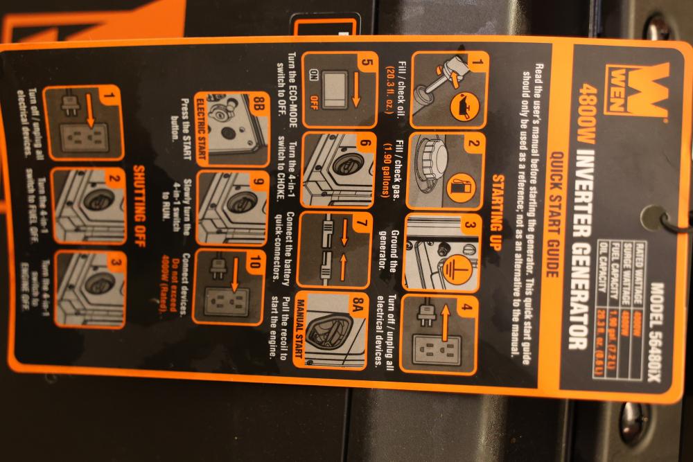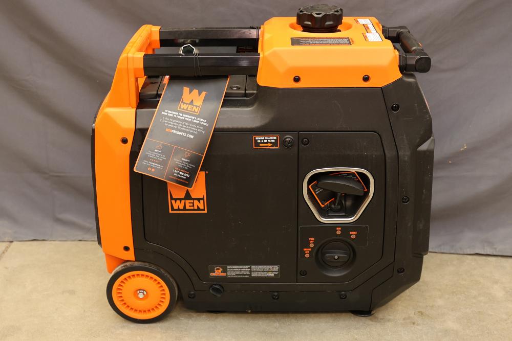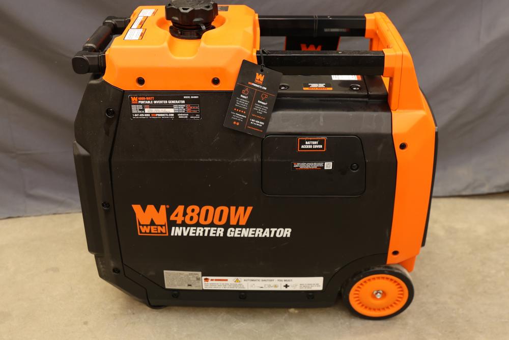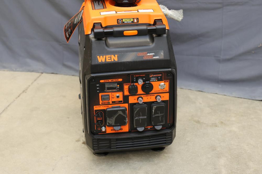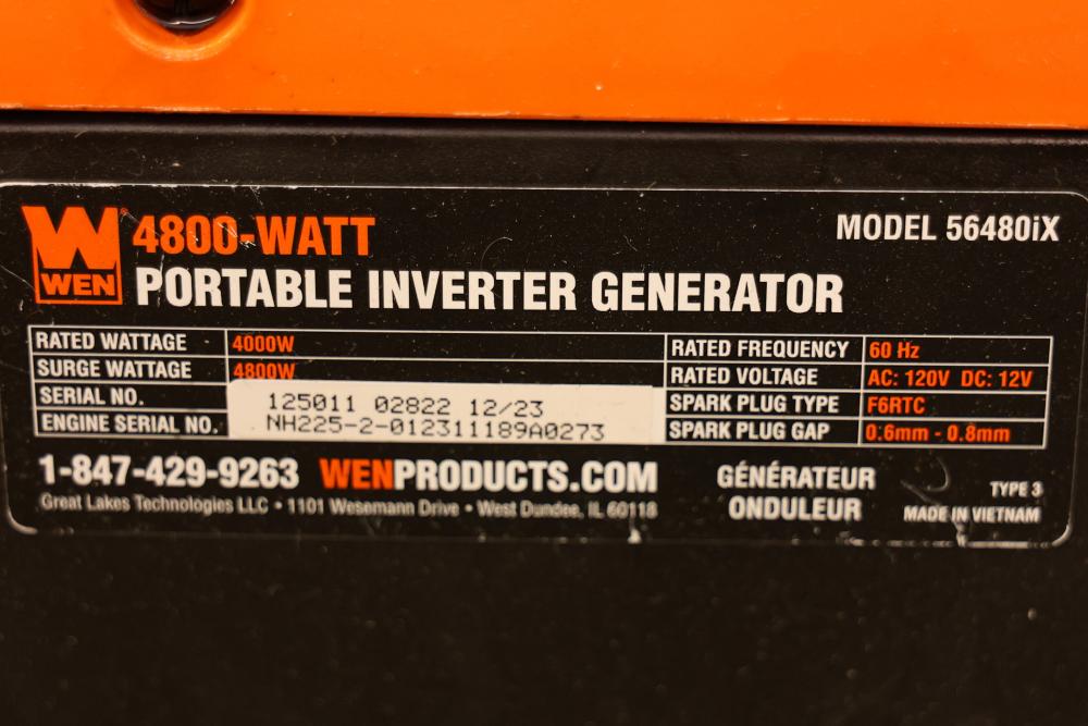 WEN 56480iX 4800-Watt Portable Inverter Generator. Rated frequency of 60 Hz, rated voltage of AC 120V DC 12V, and rated current of 33.3A. Engine spark plug type F6RTC with a gap of 0.6mm-0.8mm. Features include multiple outlets, parallel connectors, eco-mode switch, and a built-in data meter. Includes a telescoping handle and wheel setup for mobility. Pickup only.