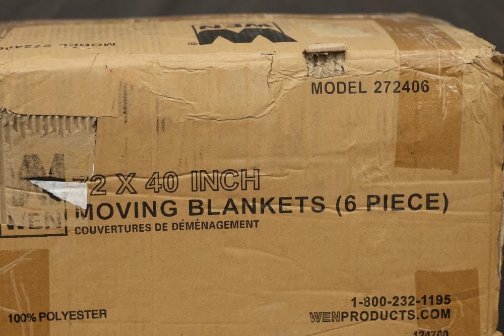 Two WEN 72 x 40 Inch Moving Blanket Bundels, Model 272406, 6 Piece Set. These sets of moving blankets are made of 100% polyester and designed for protecting items during transportation or storage. These blankets are unused. Pickup only.