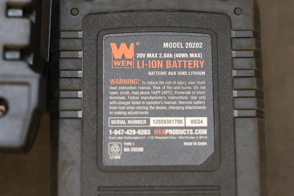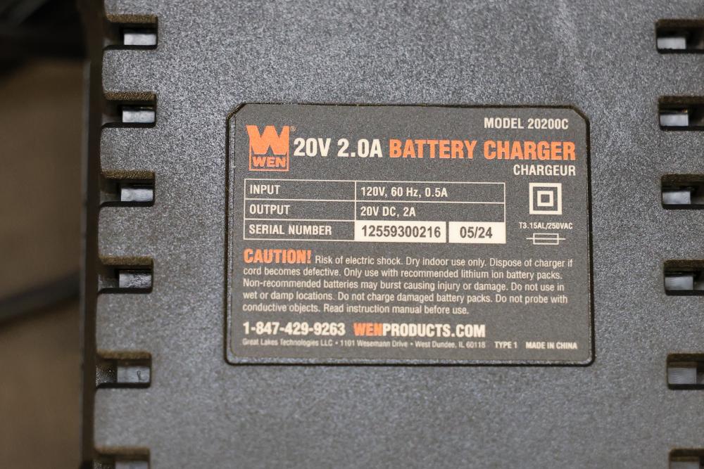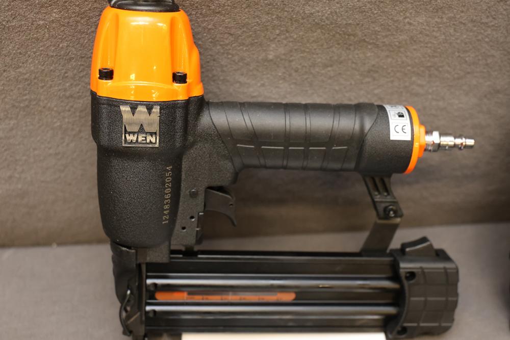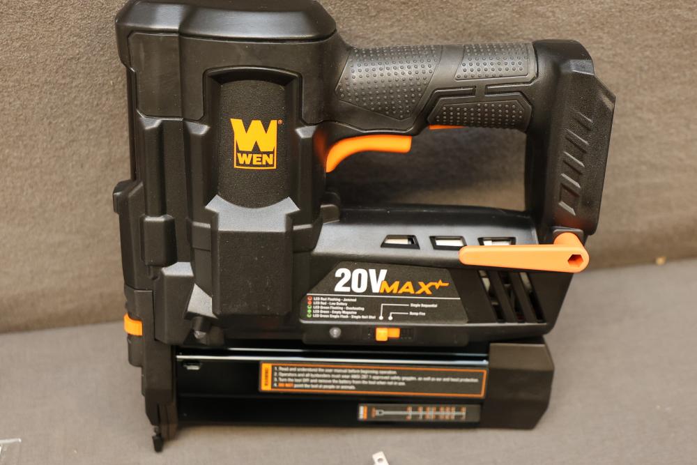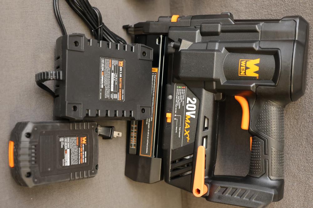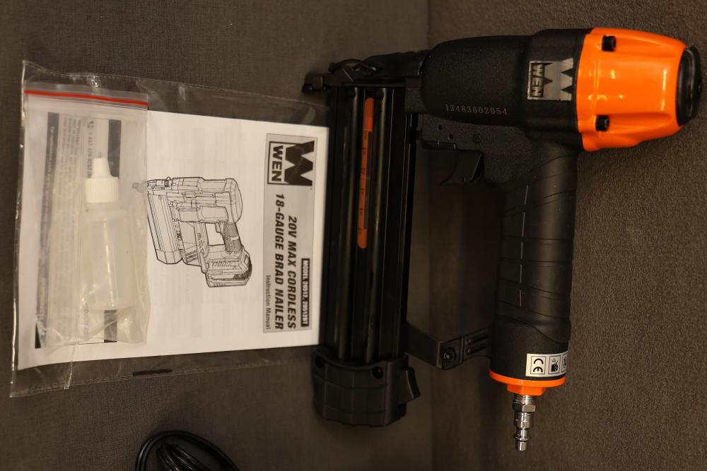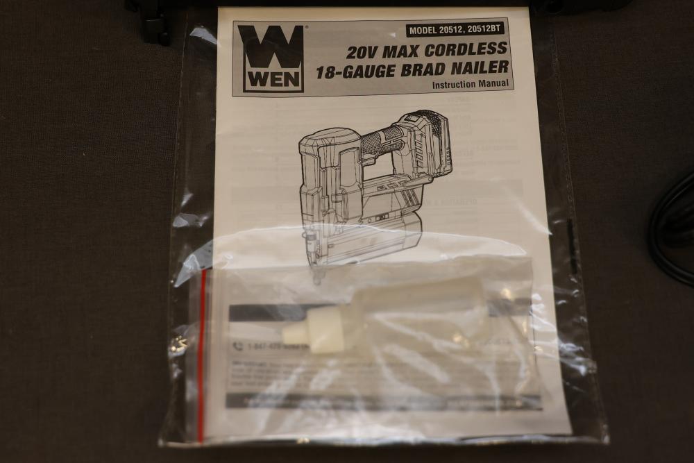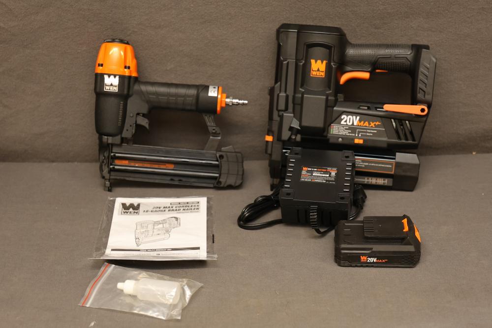 WEN 20V MAX Cordless 18-Gauge Brad Nailer and 2-Inch 18-Gauge Brad Nailer with Accessories. Includes WEN Model 20512 20V MAX Cordless 18-Gauge Brad Nailer, WEN Model 61721 2-Inch 18-Gauge Brad Nailer, Model 20202 20V MAX Lithium-Ion Battery, Model 20202C Battery Charger, manuals, and related accessories. Pickup only.