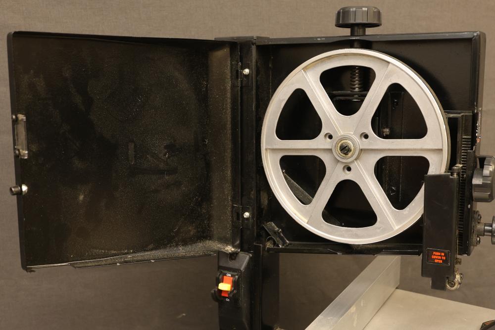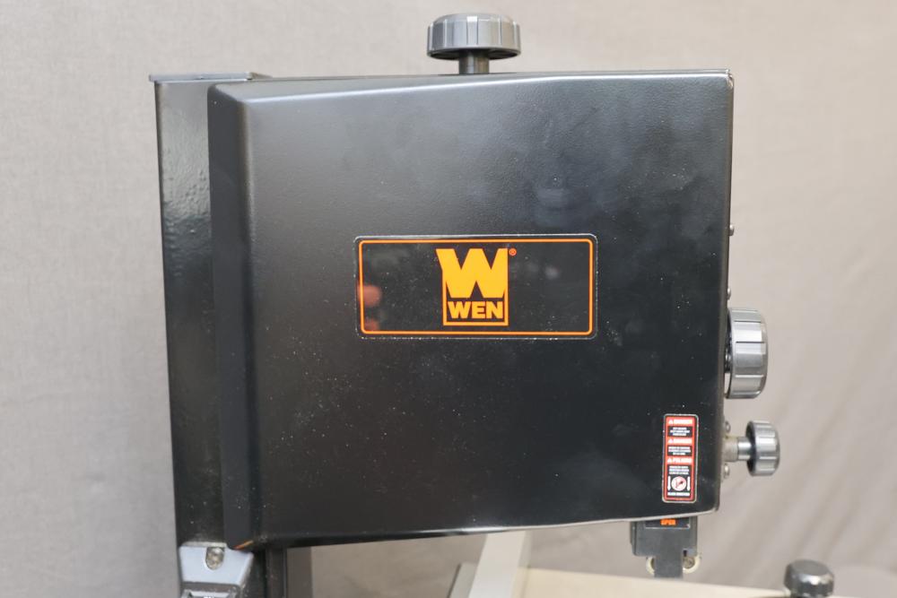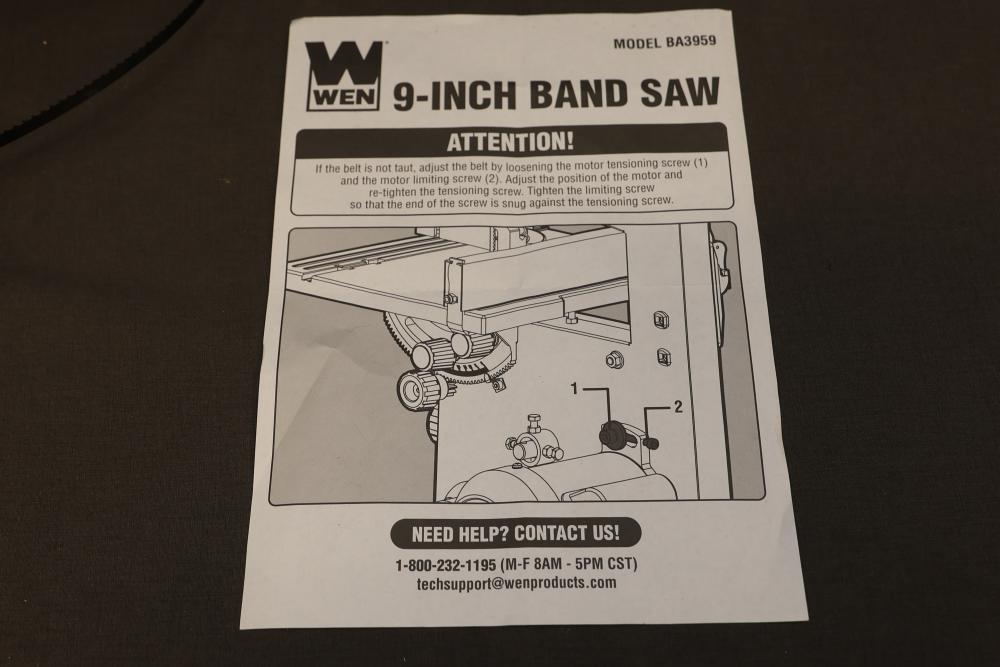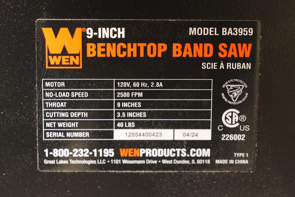 WEN 9-Inch Benchtop Band Saw Model BA3959. Features include a 2.8A motor with a no-load speed of 2500 FPM, a 9-inch throat, and a 3.5-inch maximum cutting depth. Includes instruction manual and additional accessories pictured. Pickup only.