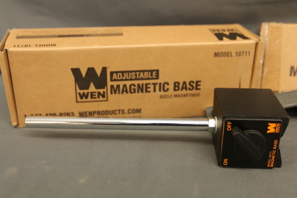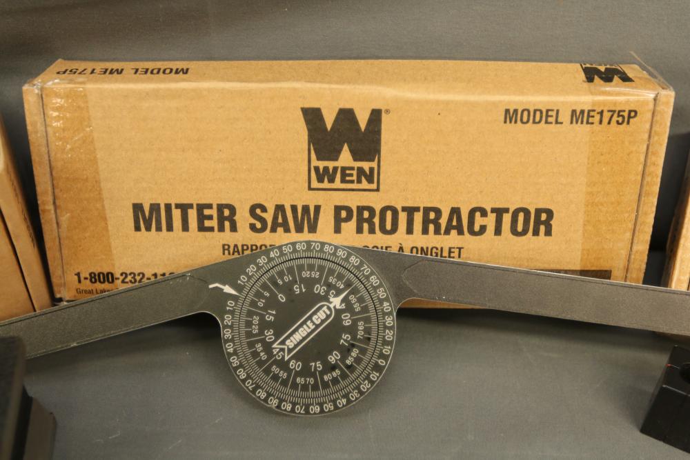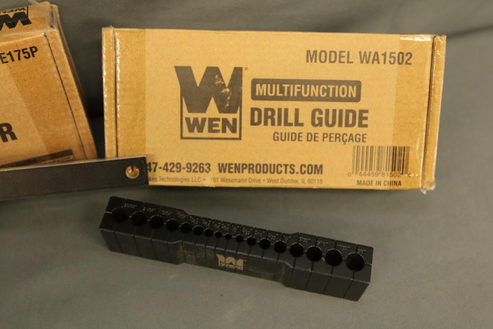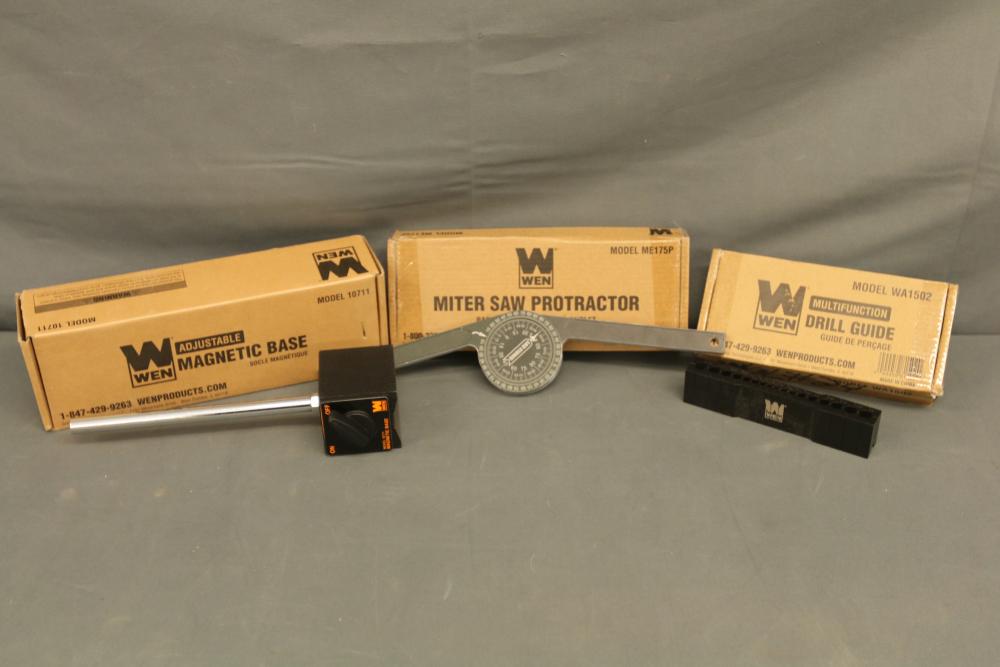 WEN Adjustable Magnetic Base, Miter Saw Protractor, and Multifunction Drill Guide. Model 10711 Adjustable Magnetic Base is for securing measuring tools during precision operations. Model ME175P Miter Saw Protractor is designed for accurate angle measurements and transferring angles for miter cuts. Model WA1502 Multifunction Drill Guide assists in accurate drilling with various hole sizes. Pickup only.
