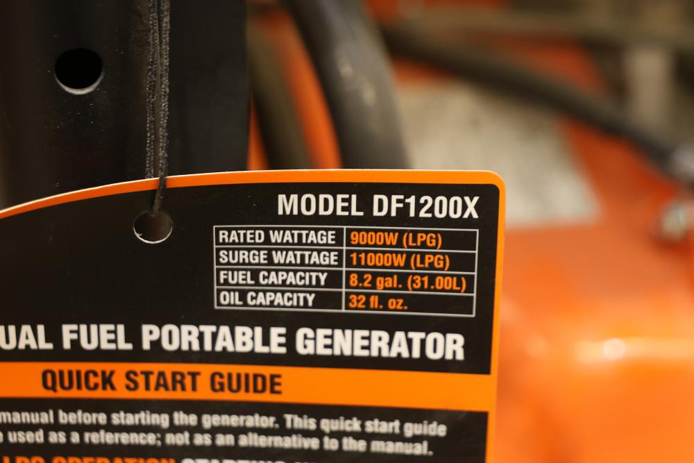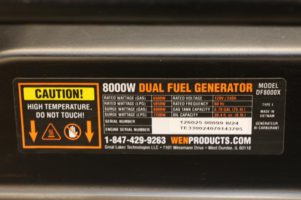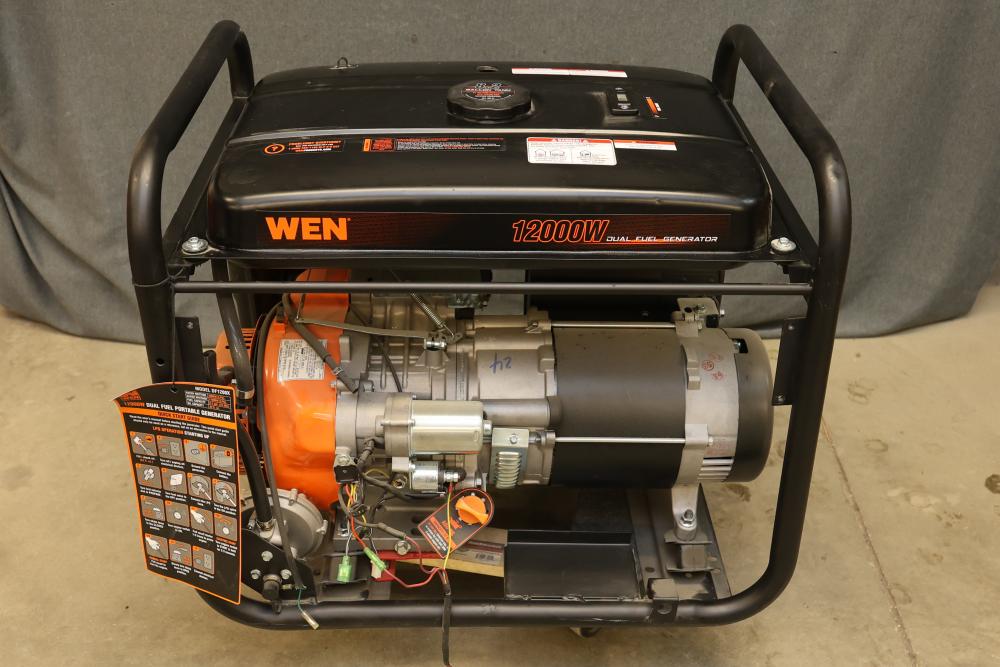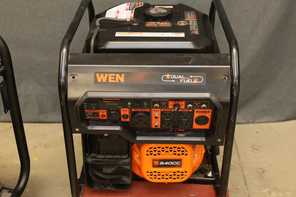 N/O WEN Dual Fuel Generators Model DF1200X and DF8000X for Parts. Model DF1200X features a rated wattage of 9000W on LPG and 9500W on gasoline, with an 8.2-gallon (31.0L) fuel tank capacity and a 32 oz oil capacity. Model DF8000X features a rated wattage of 6500W on LPG and 7000W on gasoline, with a 6.6-gallon (25.0L) fuel tank capacity and a 37 oz oil capacity. Items are nonoperational and intended for use as parts. Does not include dolly. Pickup only.