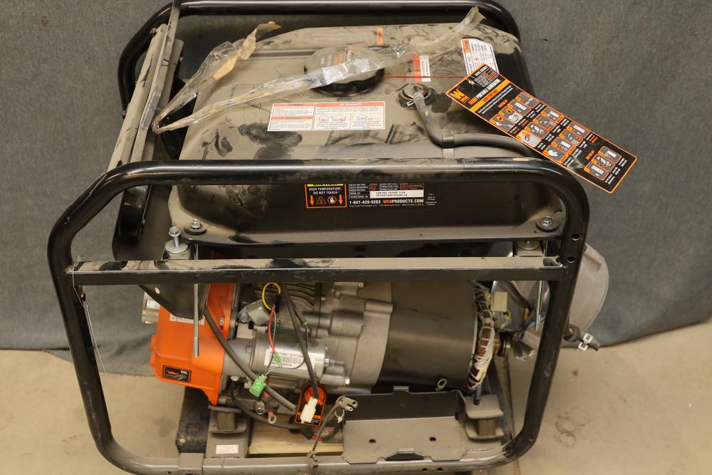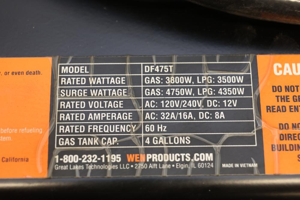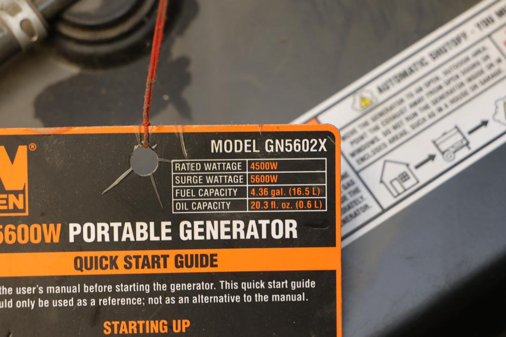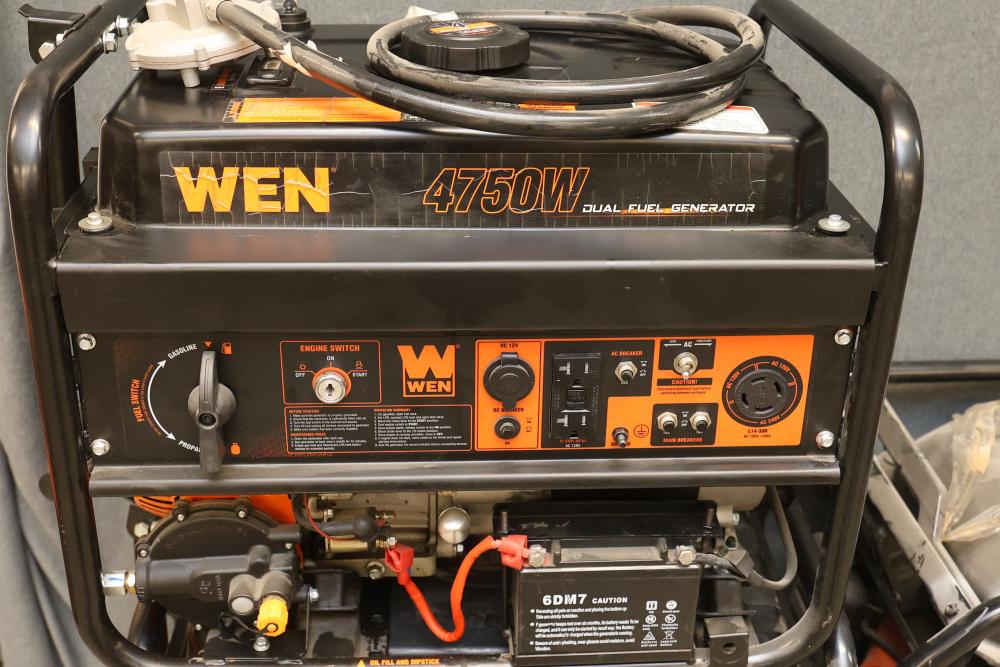 N/O WEN 4750W Dual-Fuel Portable Generators and GN5602X Portable Generator units, nonoperational and suitable for parts use only. Rated wattage specifications: 3800W (gas), 3500W (LPG) for DF475T and 4500W for GN5602X. Surge wattage specifications: 4750W (gas), 4350W (LPG) for DF475T and 5600W for GN5602X. Fuel capacity includes 4 gallons and 4.36 gallons for gas, respectively. Does not include dollies. Pickup only.