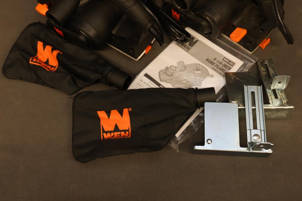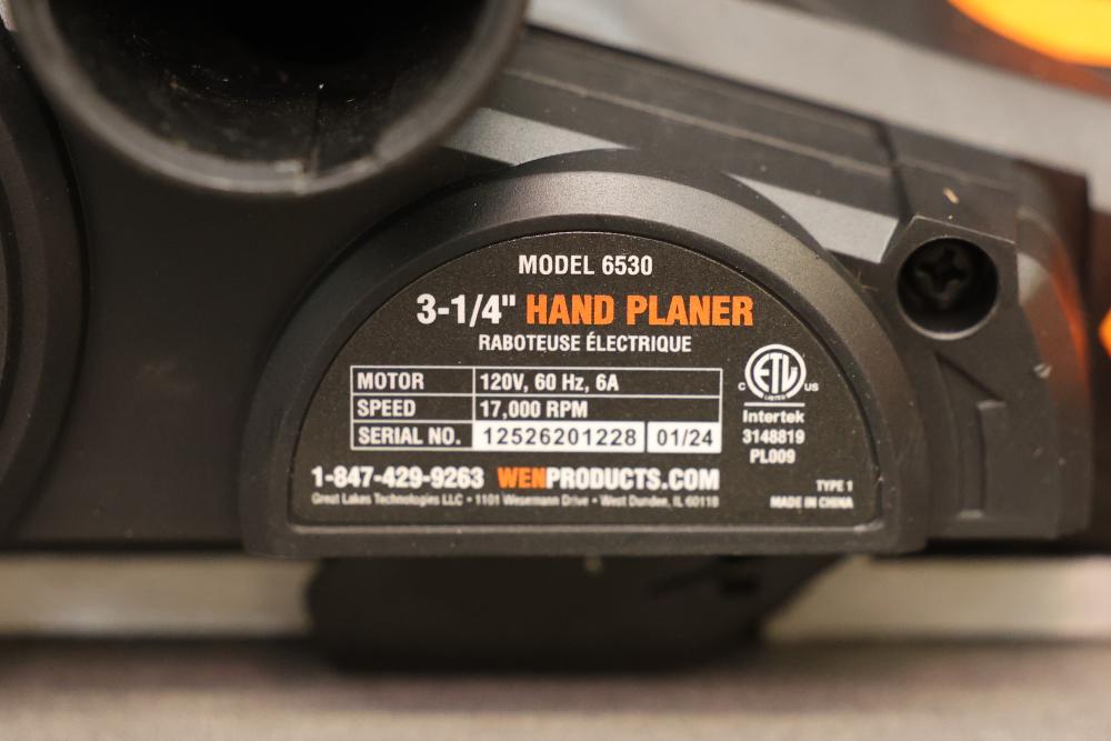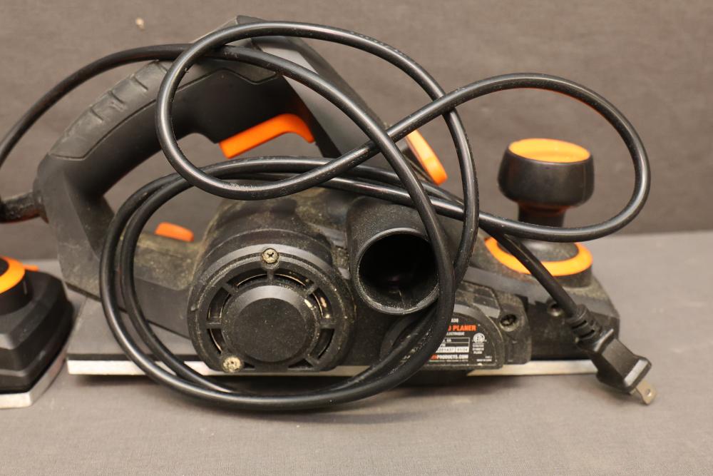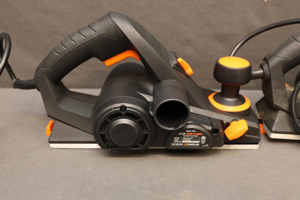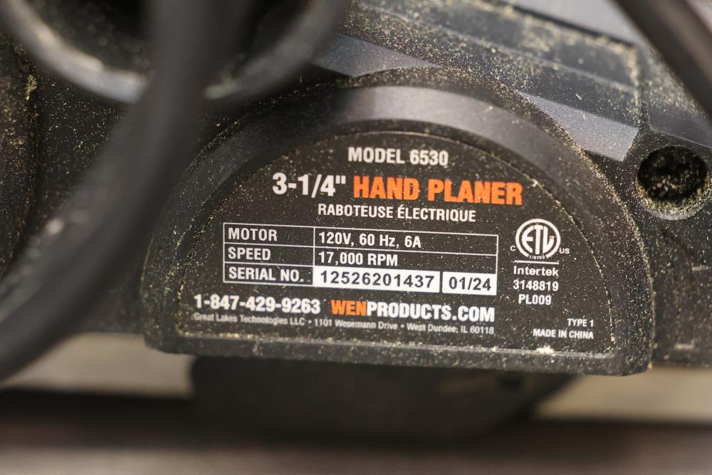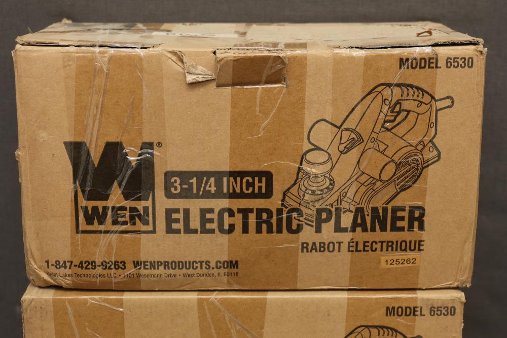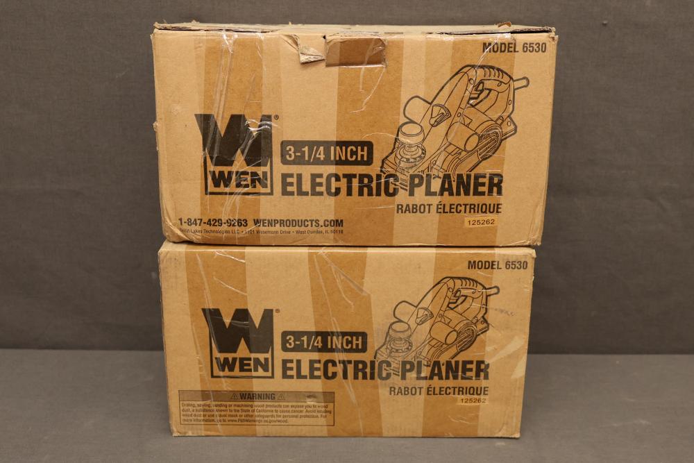 WEN Model 6530 3-1/4 Inch Electric Hand Planer with Accessories. The listing includes two hand planers, dust bags, mounting brackets, and an instruction manual. Each planer operates at 120V, 60Hz, and 6A with a motor speed of 17,000 RPM. Pickup only.