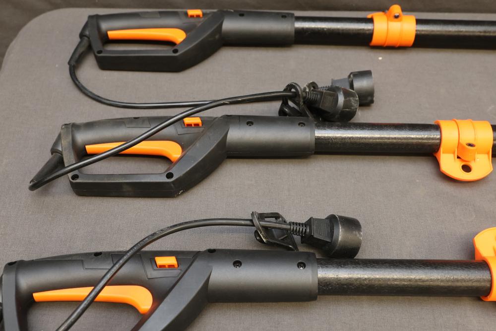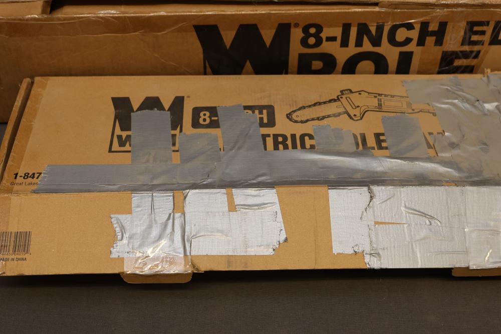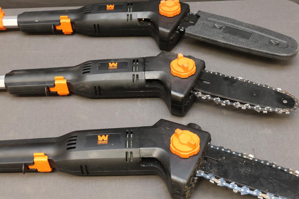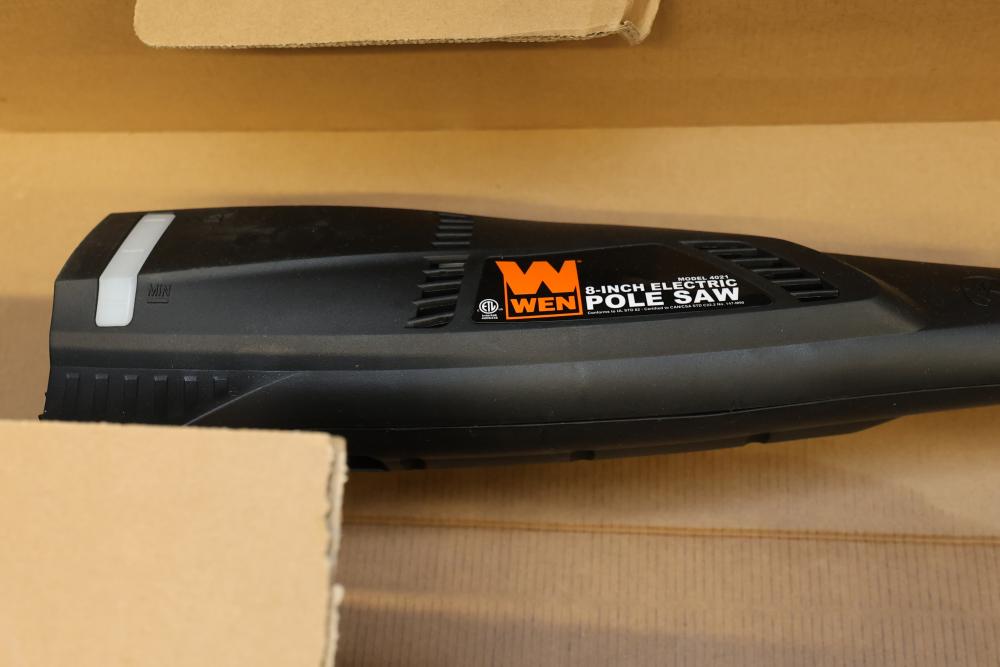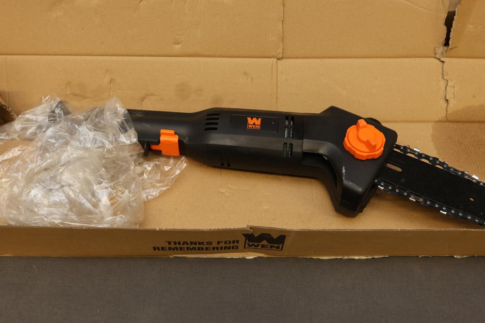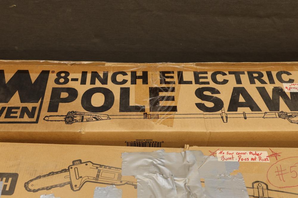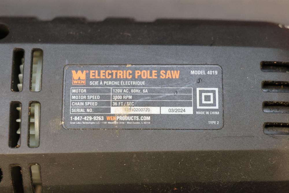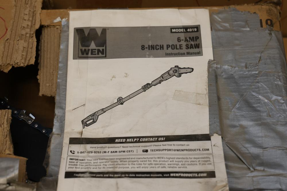 WEN Model 4019 8-Inch Electric Pole Saw, 6-Amp. Features include a motor speed of 3800 RPM and a chain speed of 36 ft/sec. Includes multiple pole sections for extended reach and user manual. Items that are not in boxes are operational. Boxed units are intended for parts. Pickup only.