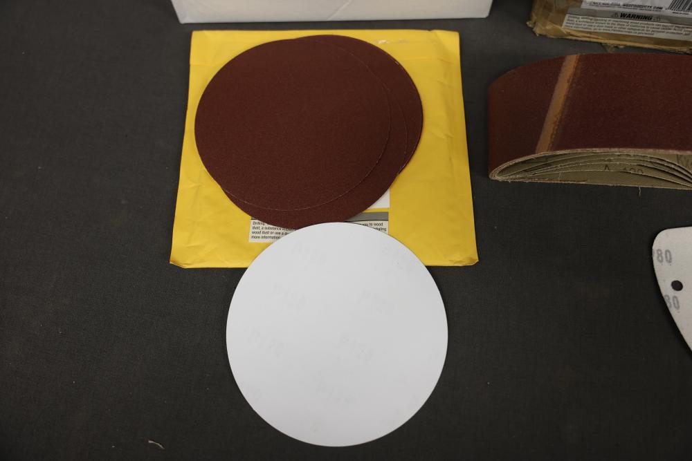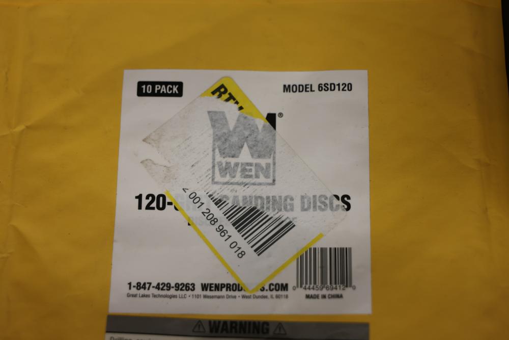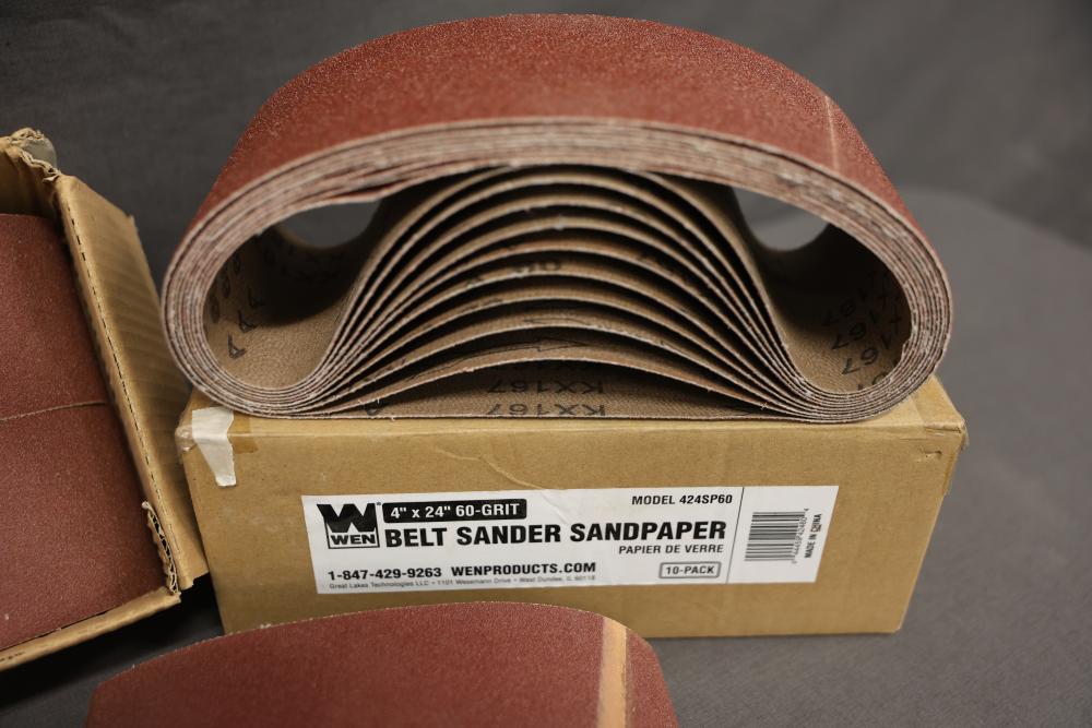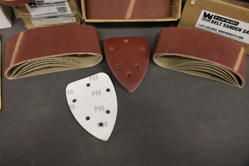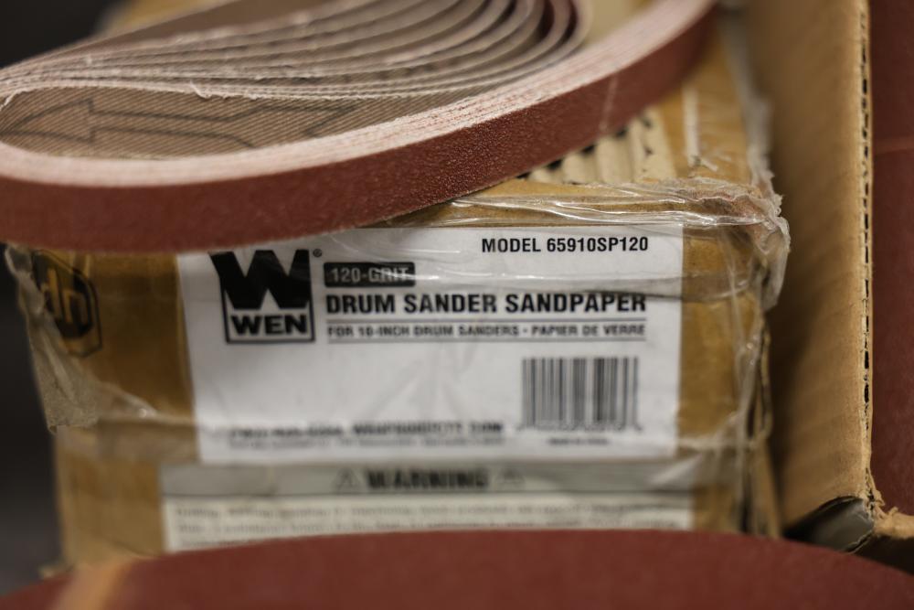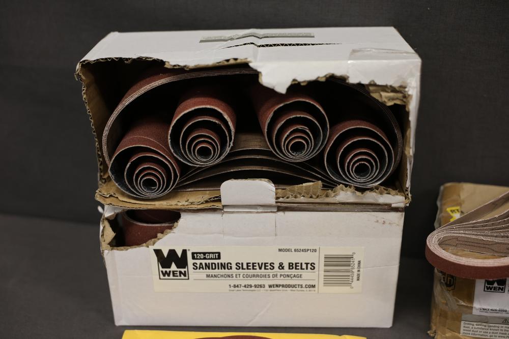 WEN Sanding Sleeves, Discs, and Belts with Models 65910SP120, 6SD120, and 4294SP. Includes drum sander sandpaper, sanding sleeves and belts, welding discs, and belt sander sandpaper. Pickup only.