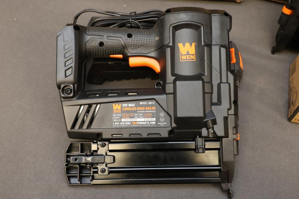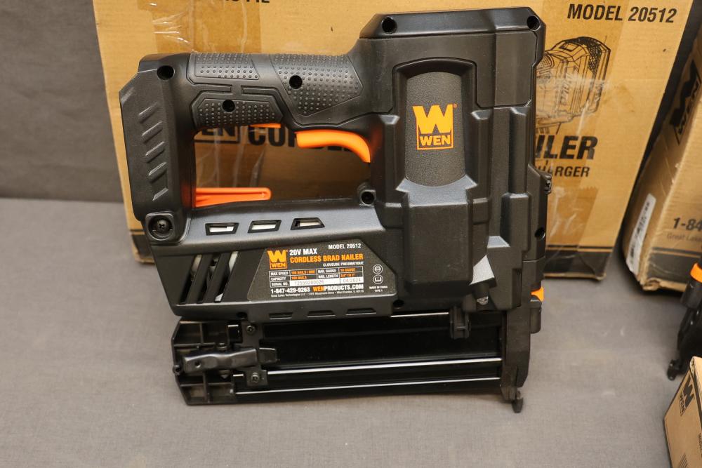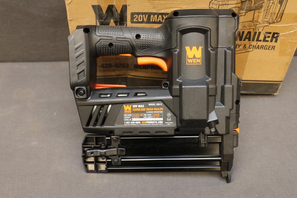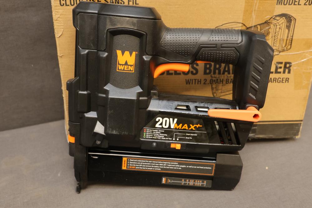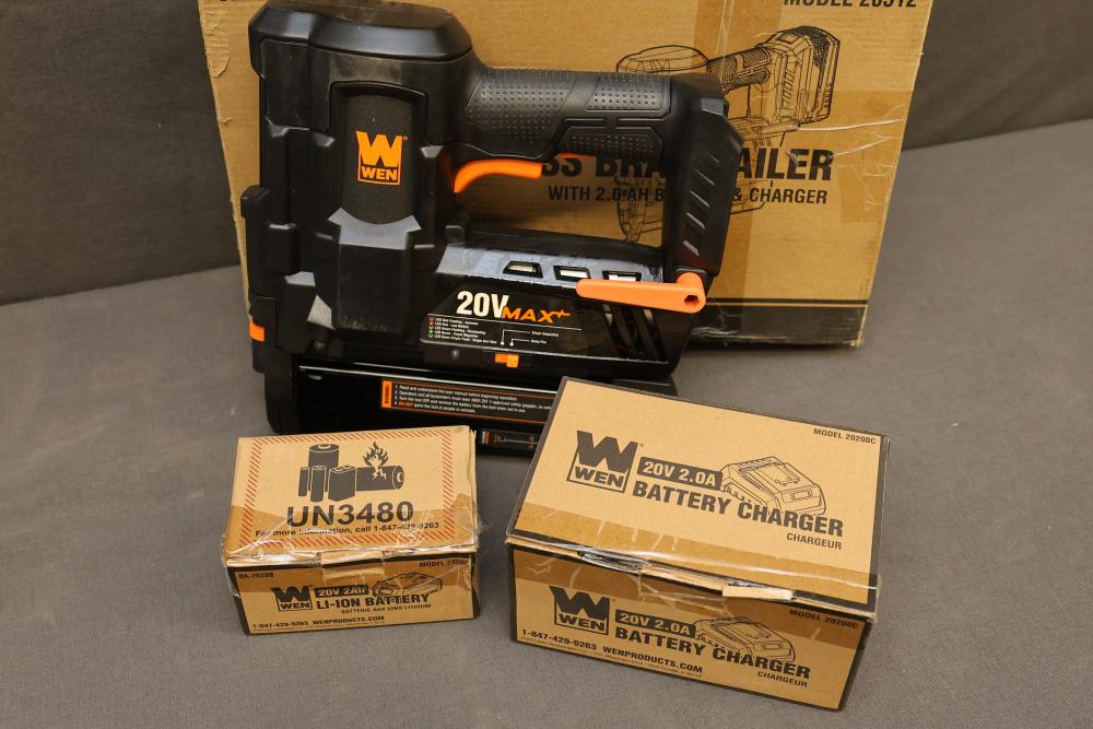 WEN 20V MAX Cordless Brad Nailer Model 20512 with Battery and Charger. Features include a maximum speed of 100 nails per minute, compatibility with 18-gauge nails, and nail length support of 3/4 inch to 2 inches. Includes 20V 2.0Ah battery and charger. Pickup only.