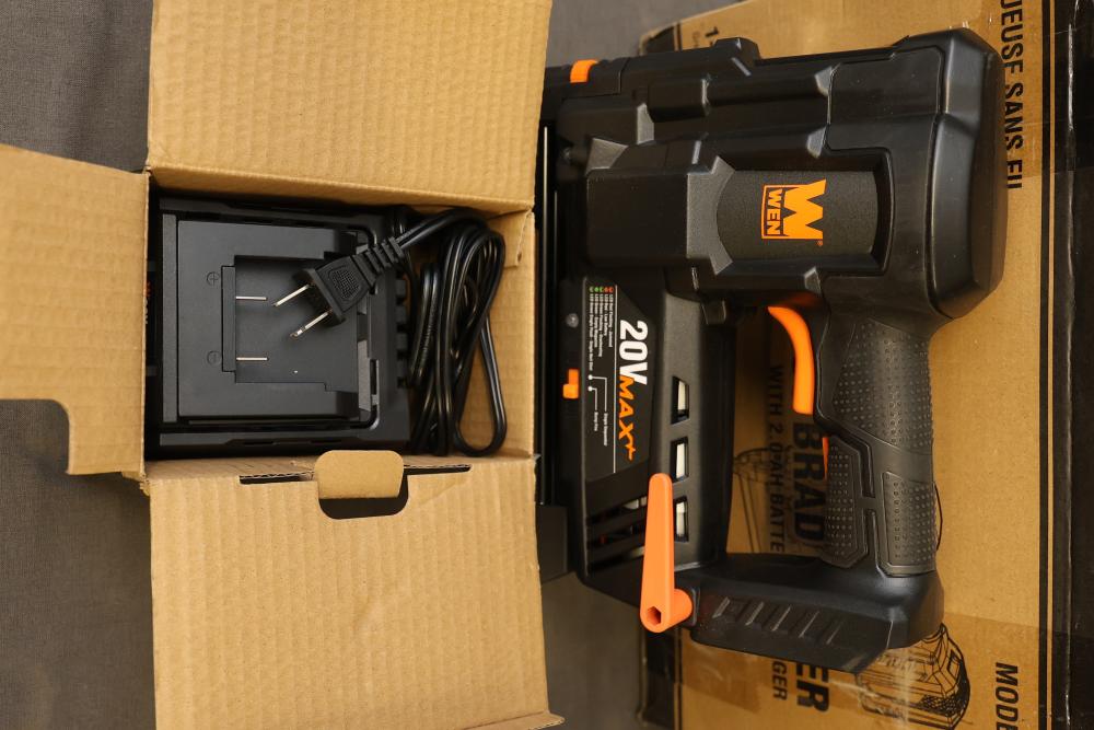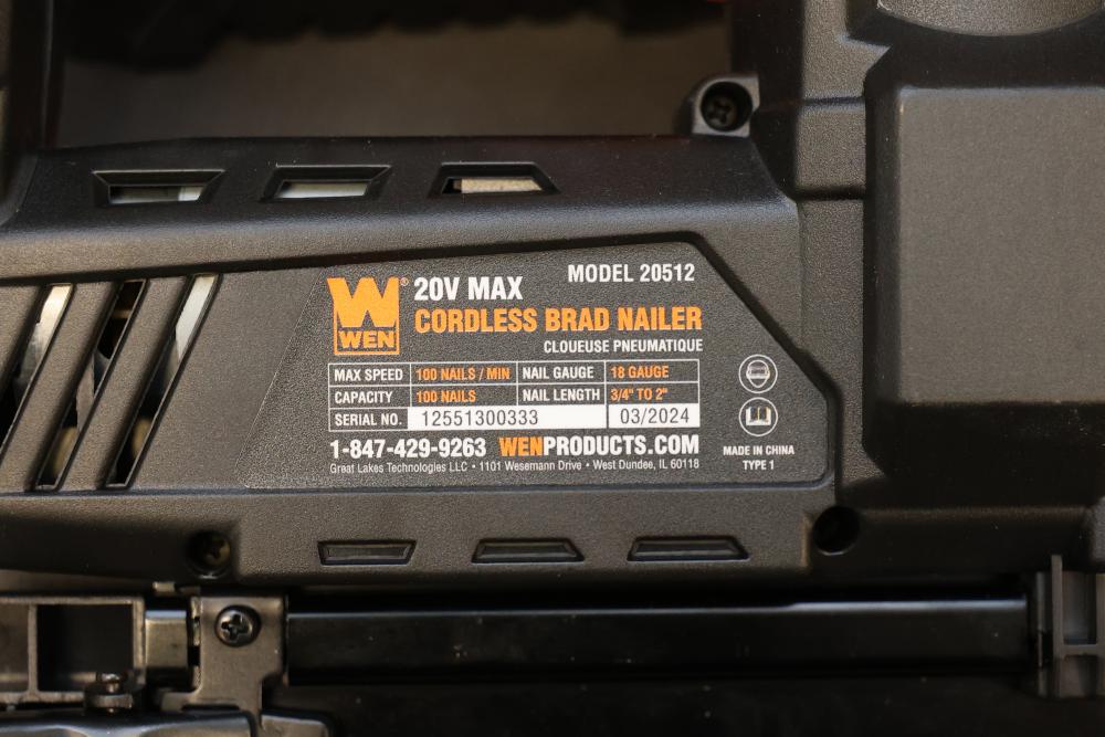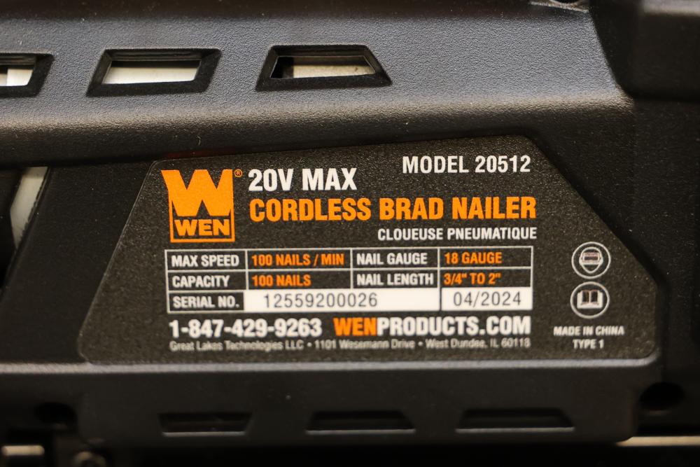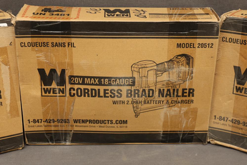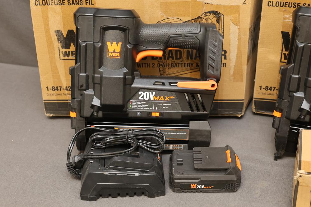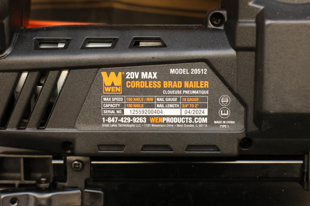 WEN 20V MAX Cordless Brad Nailer Model 20512 with Battery and Charger. Features include a maximum speed of 100 nails per minute, compatibility with 18-gauge nails, and nail length support of 3/4 inch to 2 inches. Includes 20V 2.0Ah battery and charger. Pickup only.