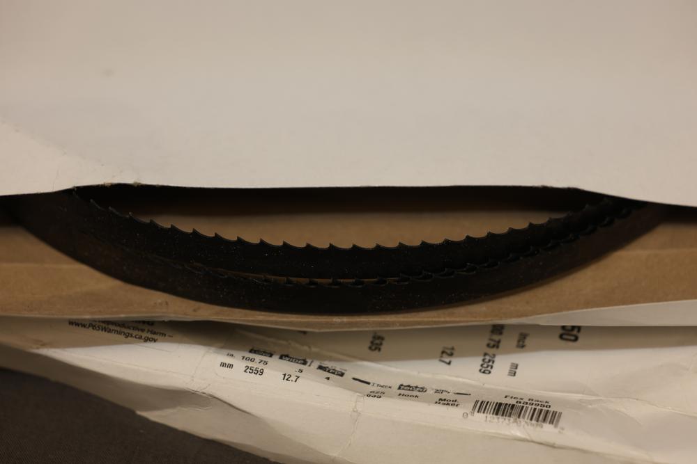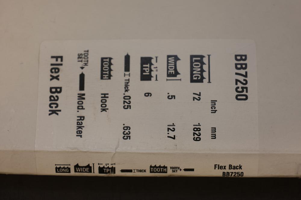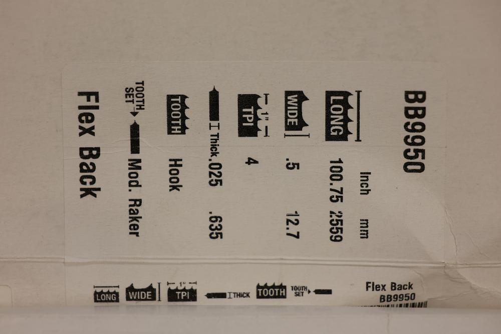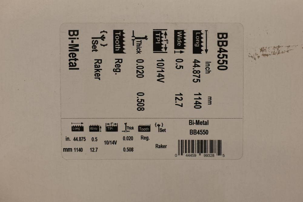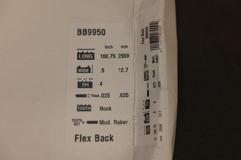WEN Bandsaw Blades BB9950, BB4550, and BB7250 Flex Back and Bi-Metal. Includes specifications: BB9950 (Long: 100.75 in, Wide: 0.5 in, TPI: 4, Thickness: 0.025 in), BB4550 (Long: 44.875 in, Wide: 0.5 in, TPI: 10/14, Thickness: 0.020 in), and BB7250 (Long: 72 in, Wide: 0.5 in, TPI: 6, Thickness: 0.025 in). Pickup only.