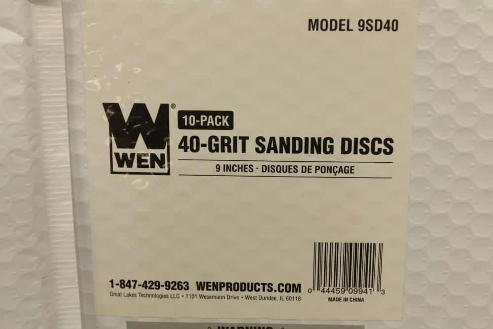 WEN Model 9SD40 10-Pack 40-Grit Sanding Discs, 9-Inch. Includes ten 40-grit sanding discs designed for 9-inch sanders. Pickup only.