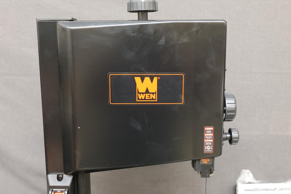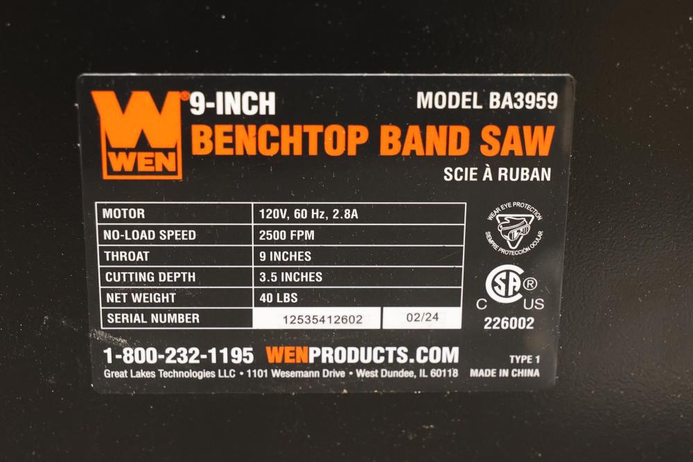 Functional WEN 9-Inch Benchtop Band Saw Model BA3959. Features include a 120V, 60Hz, 2.8A motor with a no-load speed of 2500 FPM, a 9-inch throat, and a cutting depth of 3.5 inches. Pickup only.