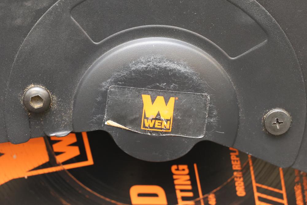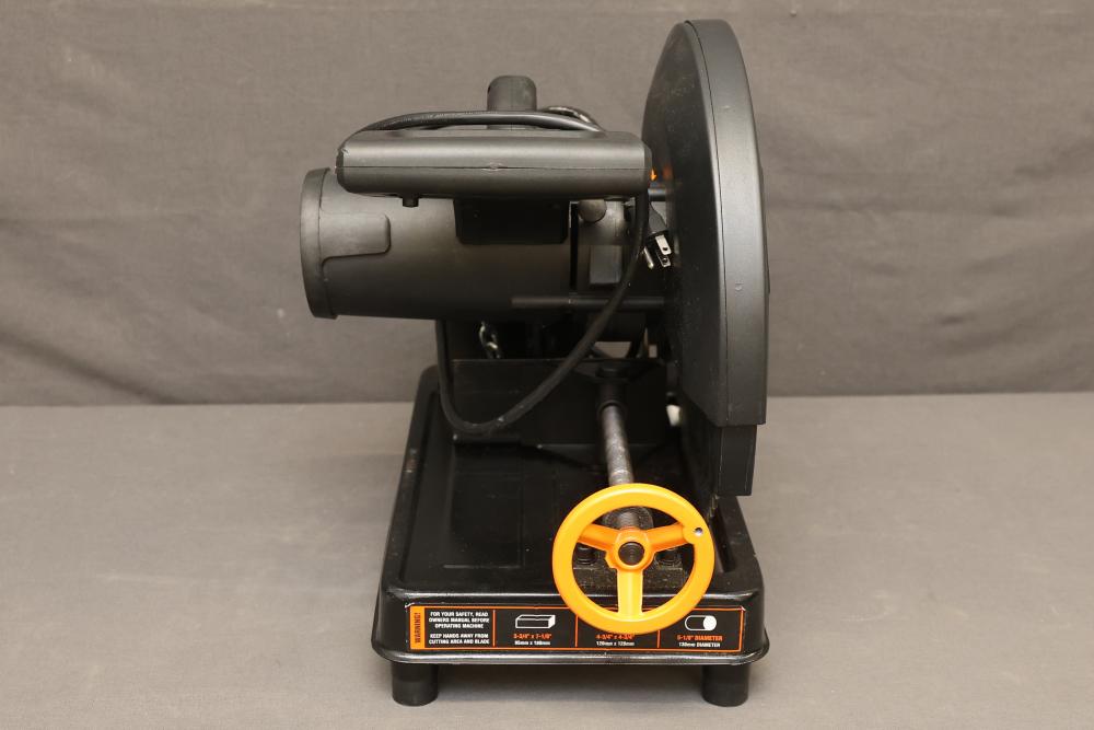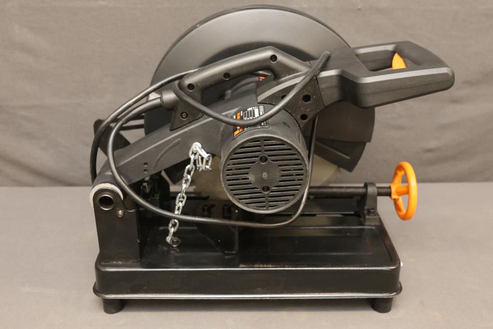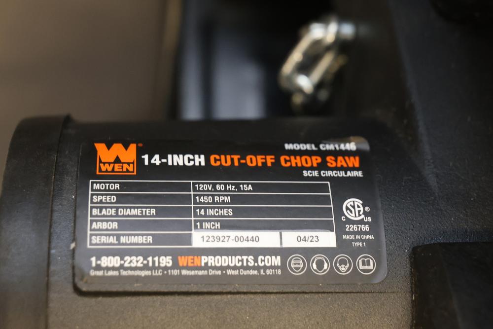 Functional WEN 14-Inch Cut-Off Chop Saw, Model CRL1466. Features include a 14-inch blade diameter, 120V motor operating at 15A, and a speed of 1450 RPM. The unit has a 1-inch arbor and is suitable for steel cutting applications. Pickup only.