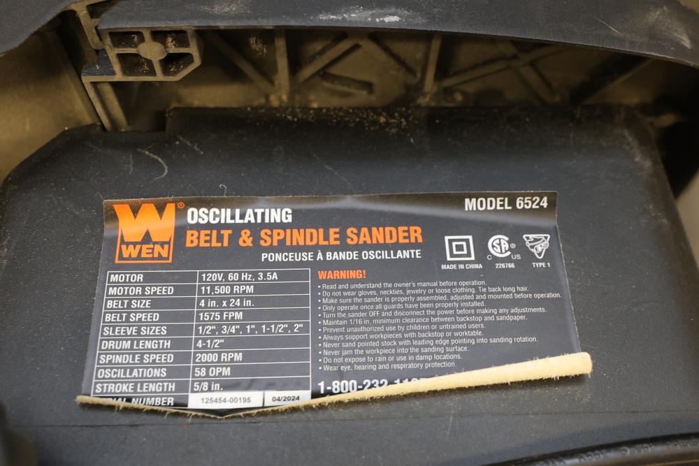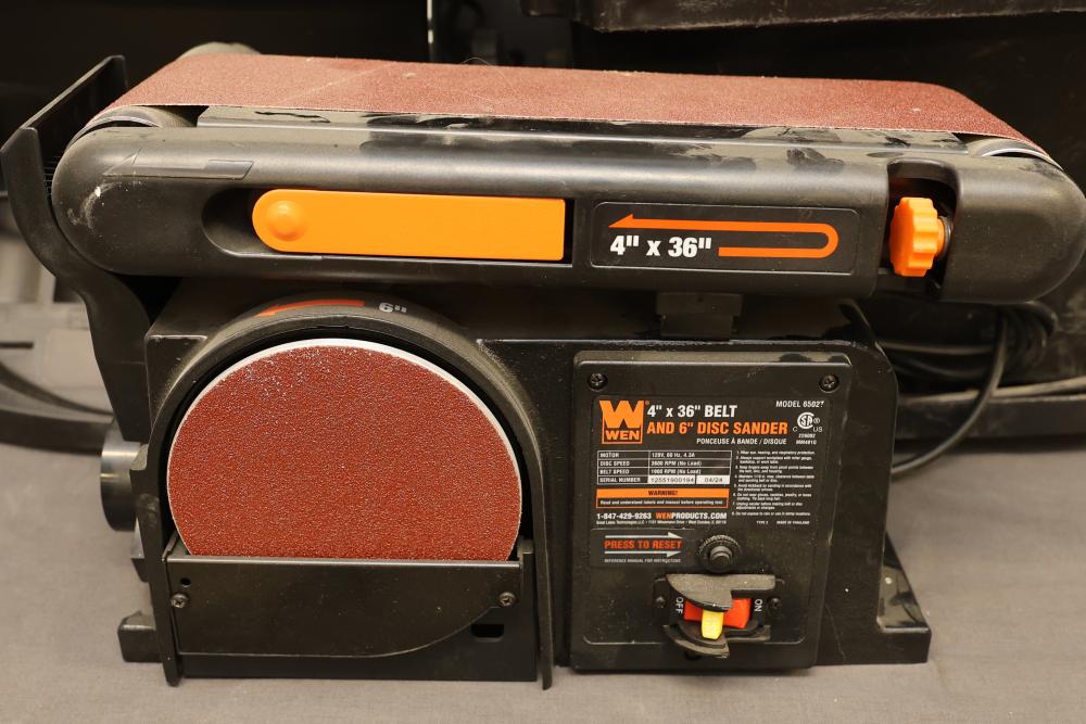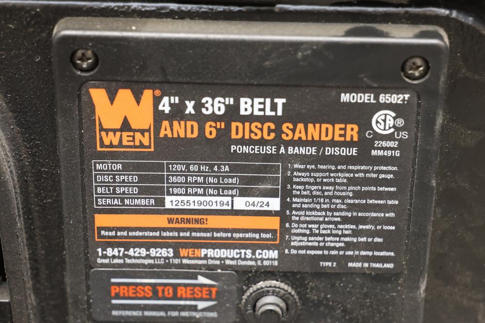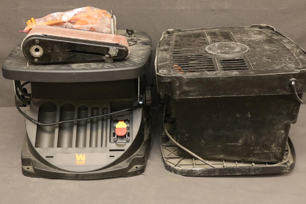 N/O WEN Oscillating Belt and Spindle Sander Model 6524, including a 4 x 36 belt and 6 disc sander Model 6502T. All items are nonoperational and to be used for parts. Includes components shown in images. Pickup only.