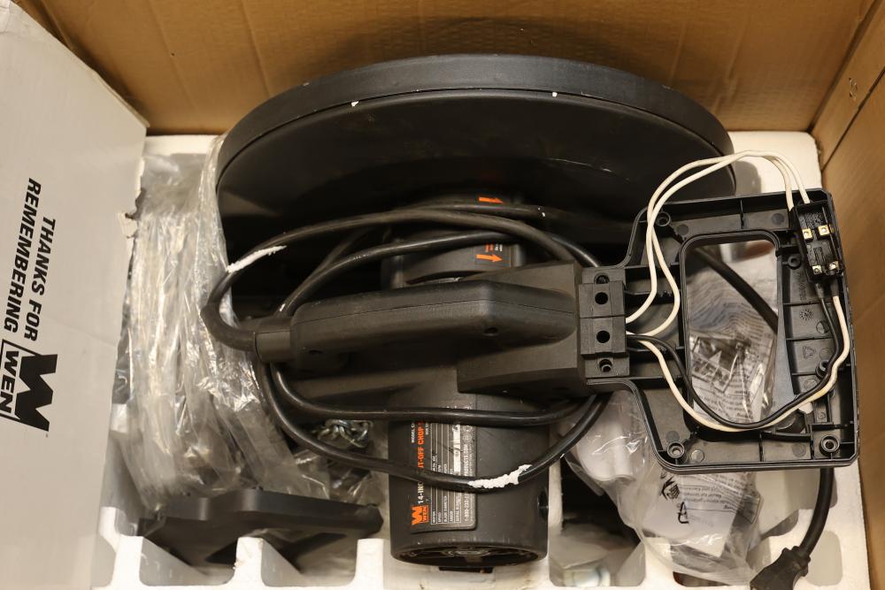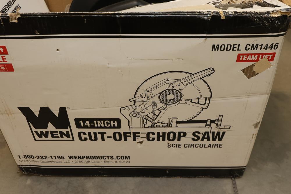 WEN N/O Tools and Equipment Including Plate Compactor, Chop Saw, Miter Saw, Air Filtration System, and Dust Collector. Includes the WEN Construction Zone Plate Compactor (Model 56635T), 14-inch Cut-Off Chop Saw (Model CM1446), 10-inch Miter Saw (Model MM1011), Air Filtration System (Model 3410), and Dust Collector (Model DC3474). Items are nonoperational. Does not include dolly. Pickup only.