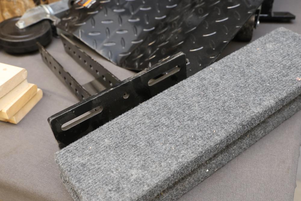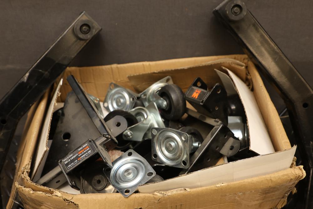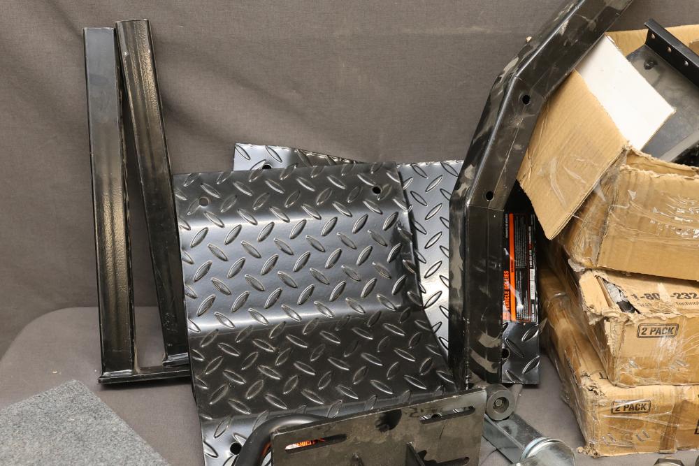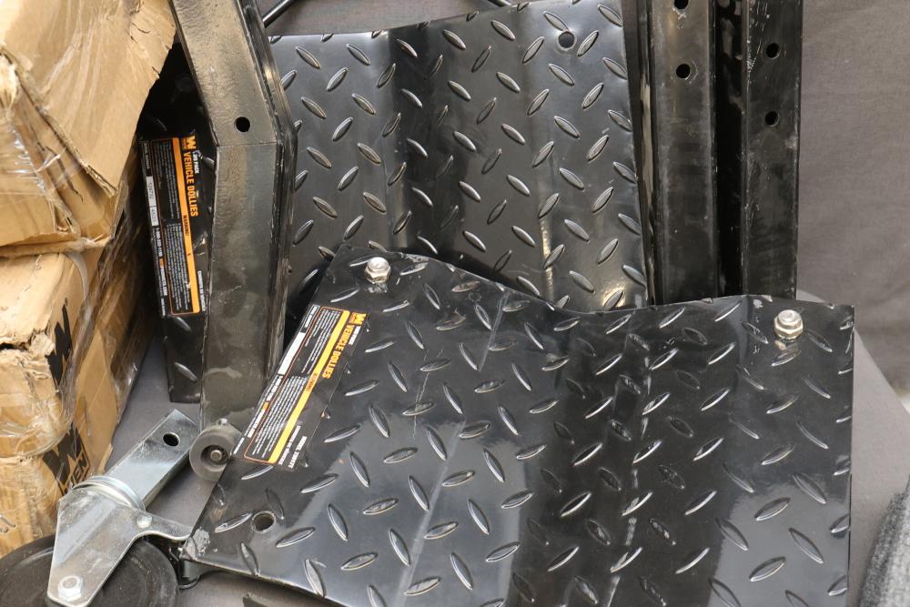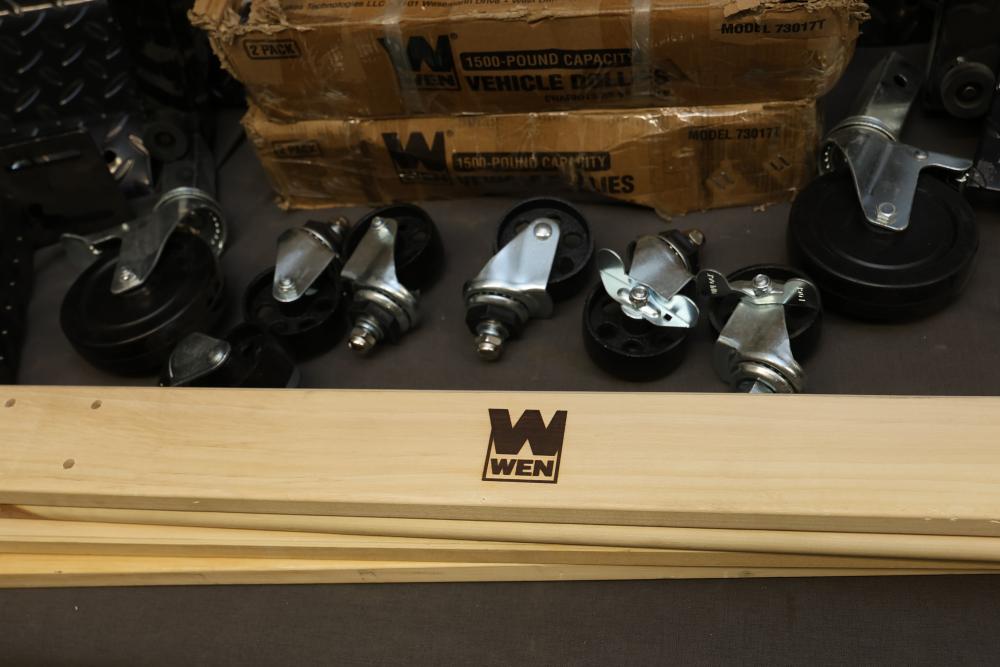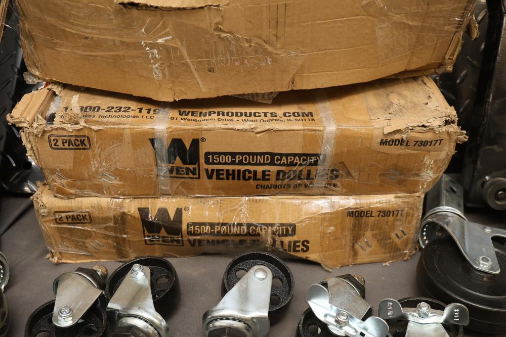 WEN 73017 1500-Pound Capacity Vehicle Dollies With Various Components. Includes two packs of WEN 73017 vehicle dollies labeled for 1500-pound capacity, caster wheels, steel brackets, diamond-plate components, and other associated pieces. Pickup only.