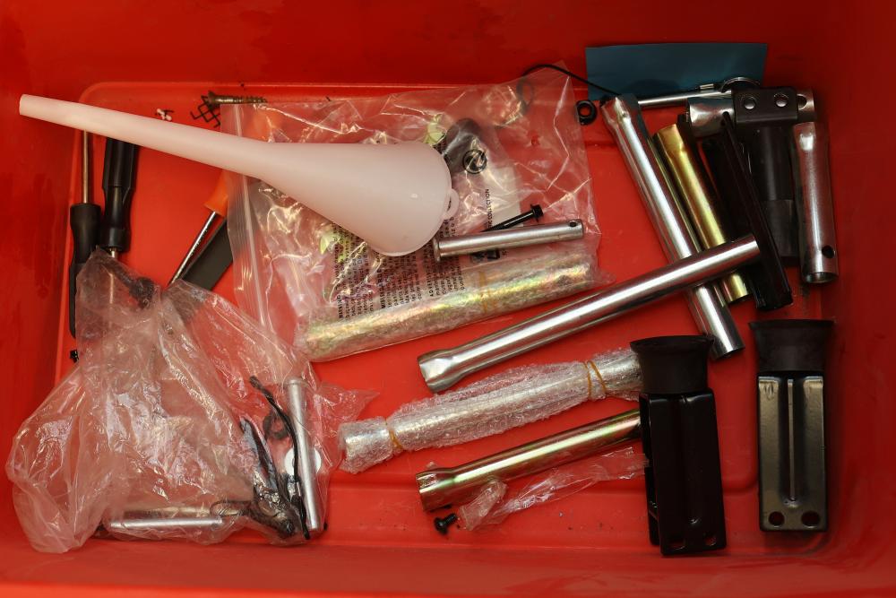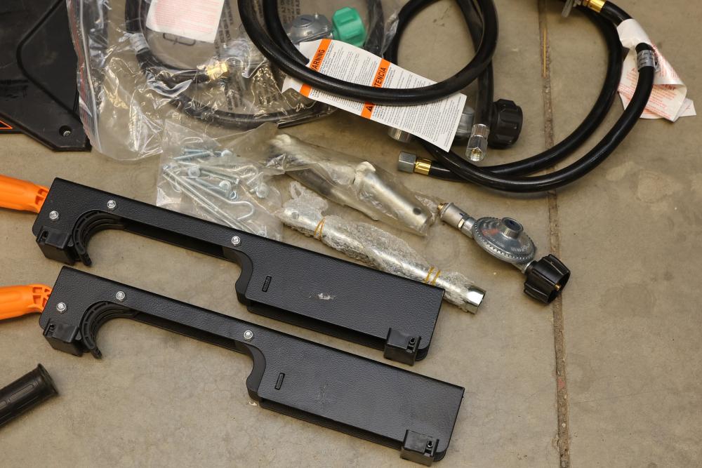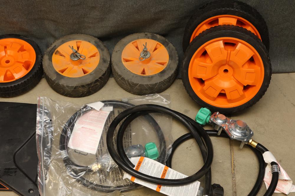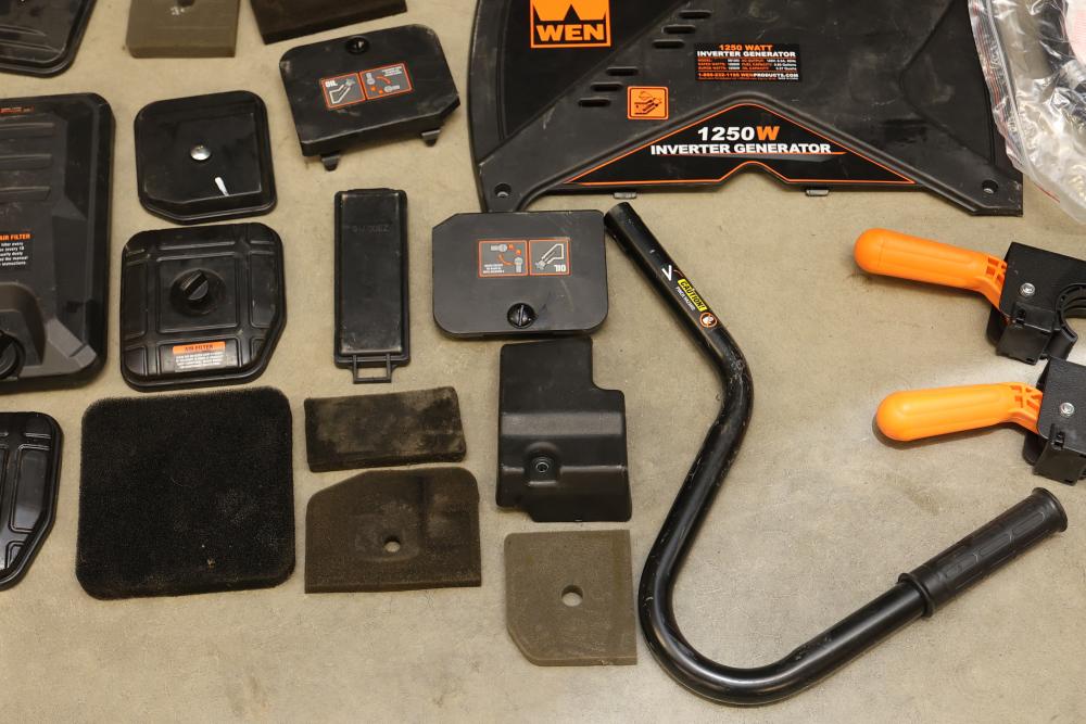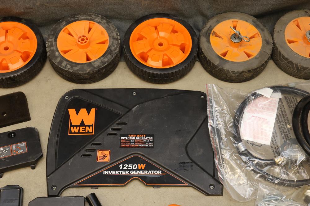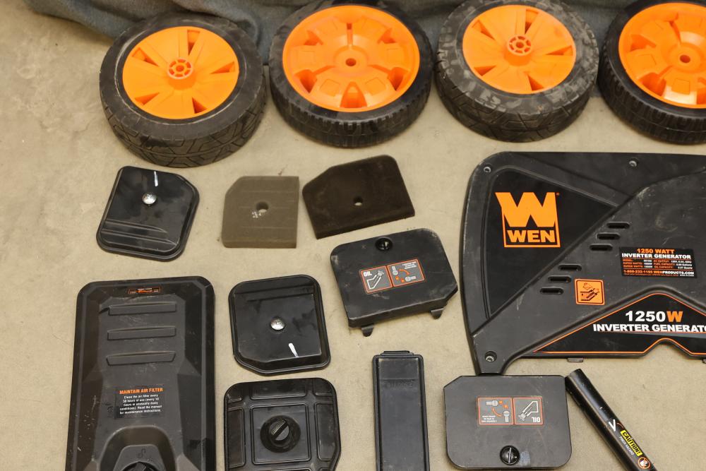 Generator Parts Including Wheels, Frame Components, and WEN 1250W Panel. Includes eight orange and black wheels, black frames, hoses, clamps, various panels, hardware fasteners, and a WEN 1250W inverter generator panel. Pickup only.