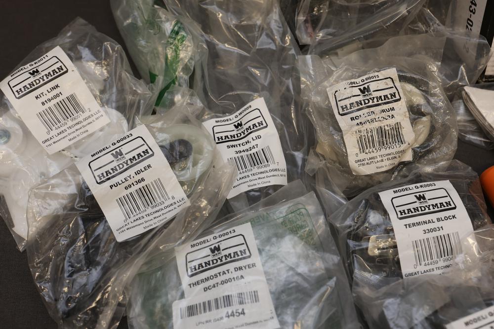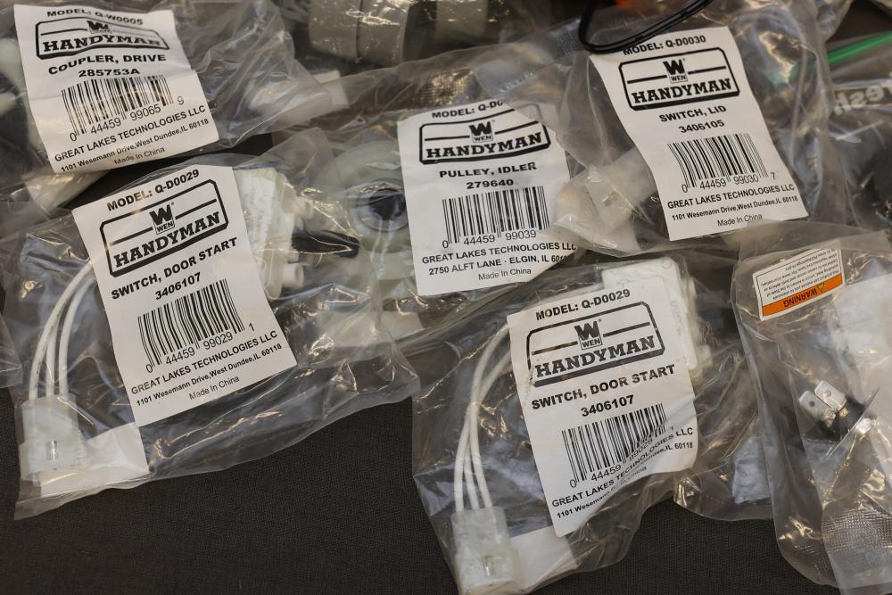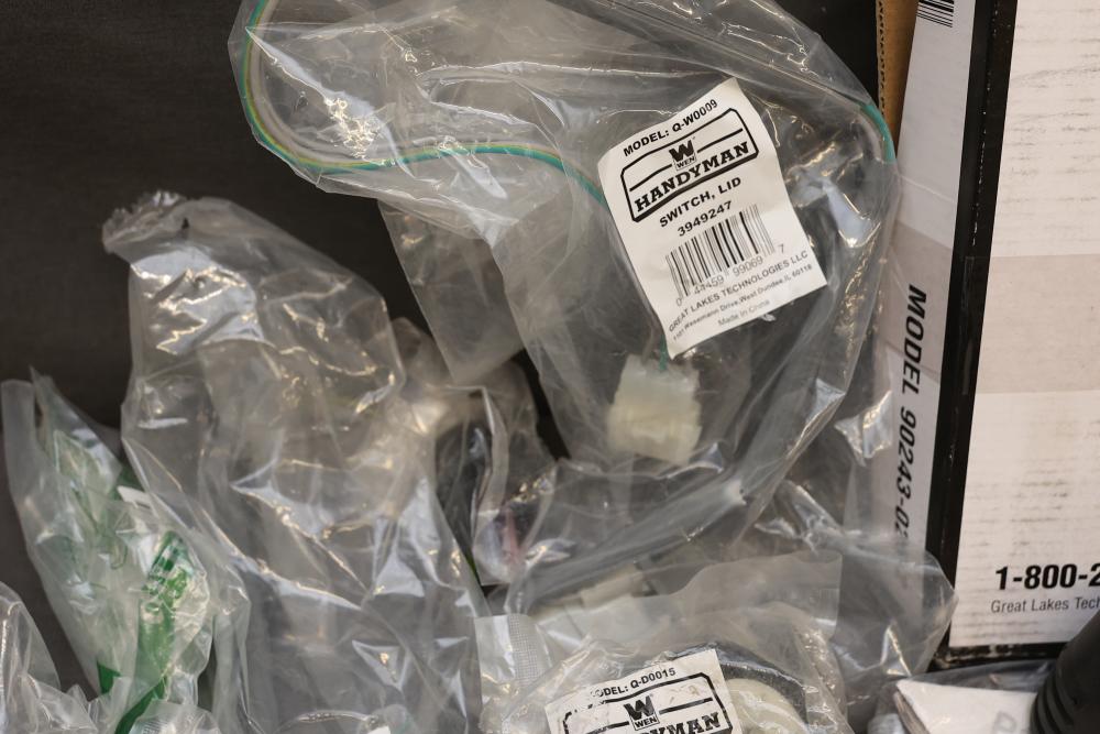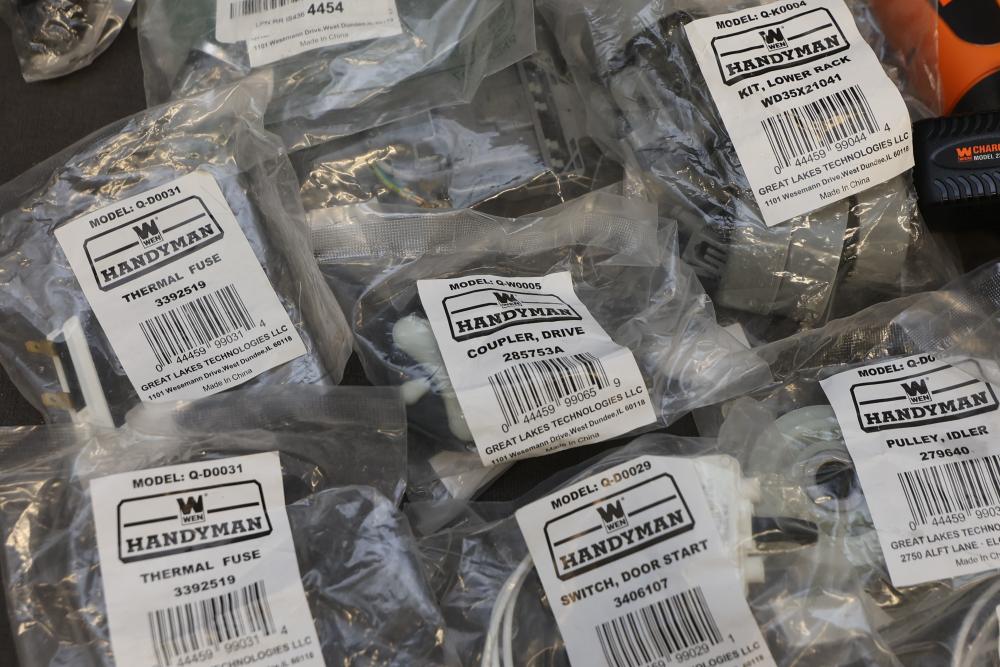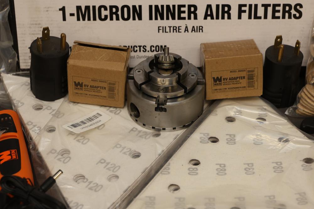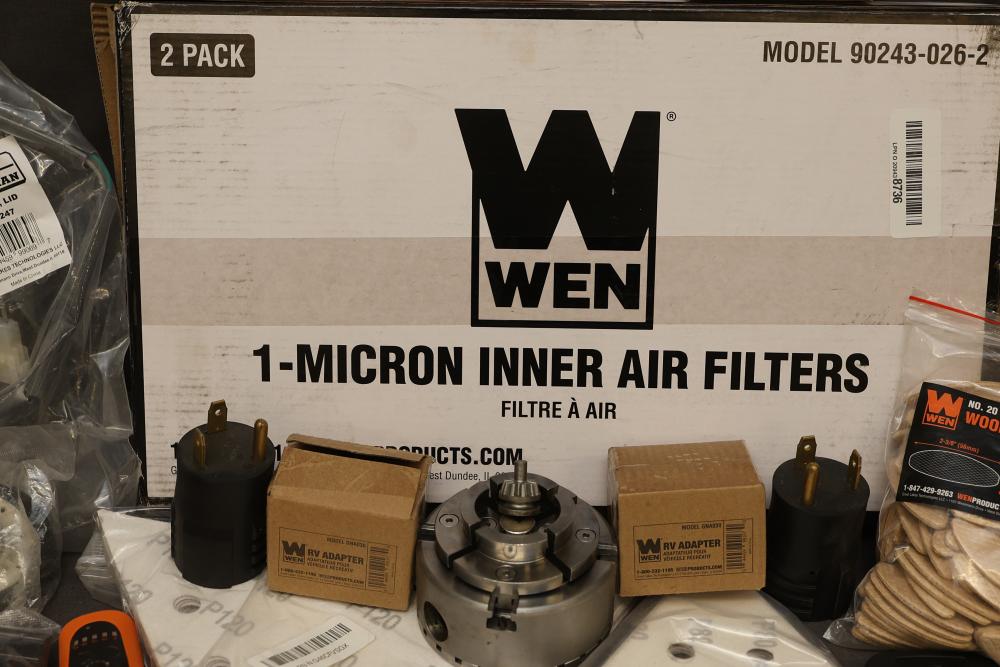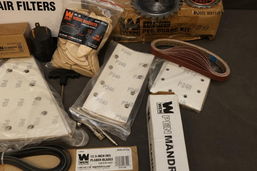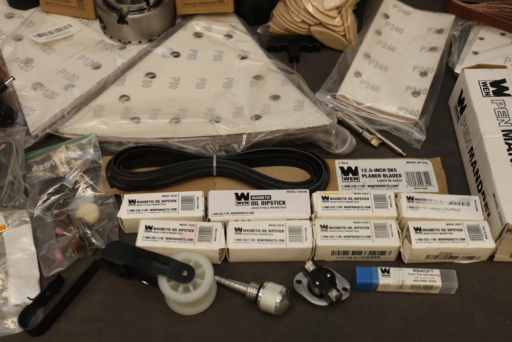 WEN Handyman Components, Sandpaper, Cutting Discs, Air Filters, and Accessories. Includes: Wen branded 1-micron inner air filters (Model: 90243-026-2), sandpaper sheets (P80, P120, P240 grit), cutting discs (7 1/4 inch 40T fiber cement and laminate, and 6 1/2 inch 16T track saw blade), various oil sticks, 115-piece peg board kit (Model: WB114S), planer blades (1.25 inch HSS), and RV plug adapters. Also features labeled parts such as thermal fuses, pulleys, switches, terminal blocks, and couplers. Pickup only.
