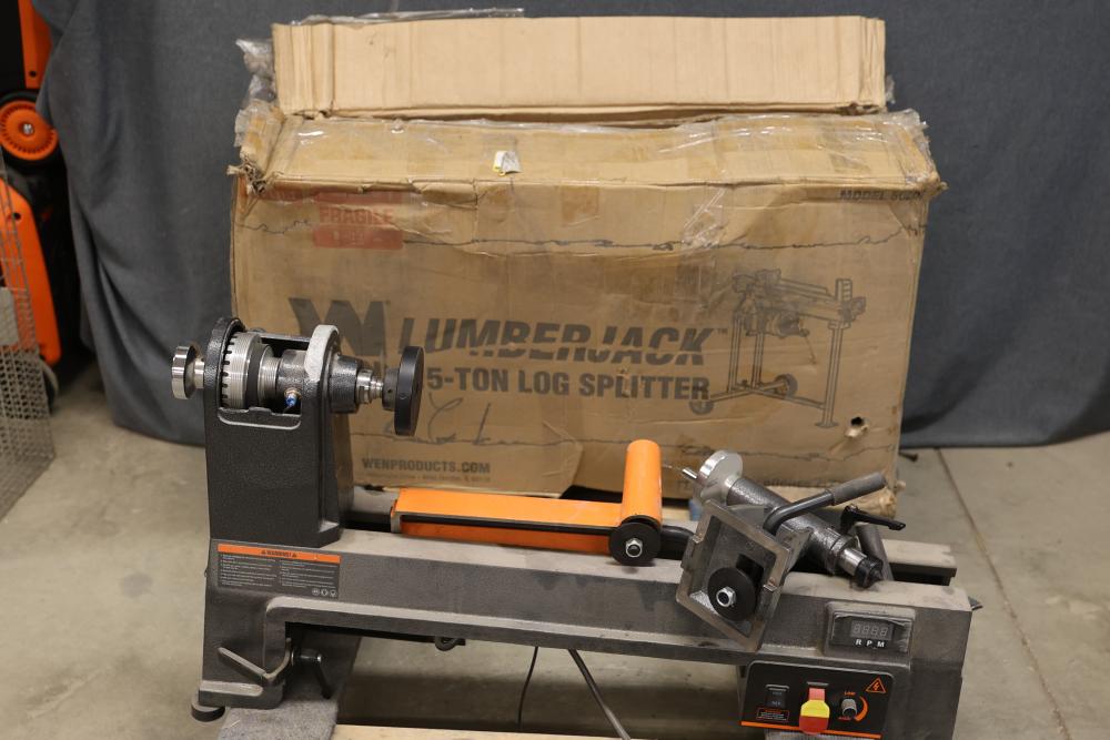 N/O WEN Model 56208 Lumberjack 6.5-Ton Log Splitter and Lathe for Parts. Items are nonoperational and suitable for parts. Includes visible attachments and components as shown. Pickup only.