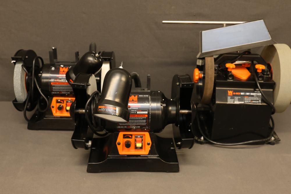 WEN Bench Grinder and Wet/Dry Sharpener models include two BG4280 units and one BG4270T. One BG4280 is bent but operational, while the other BG4280 is operational but the wheels do not turn. The BG4270T features a bent shaft. Pickup only.
