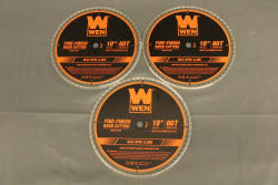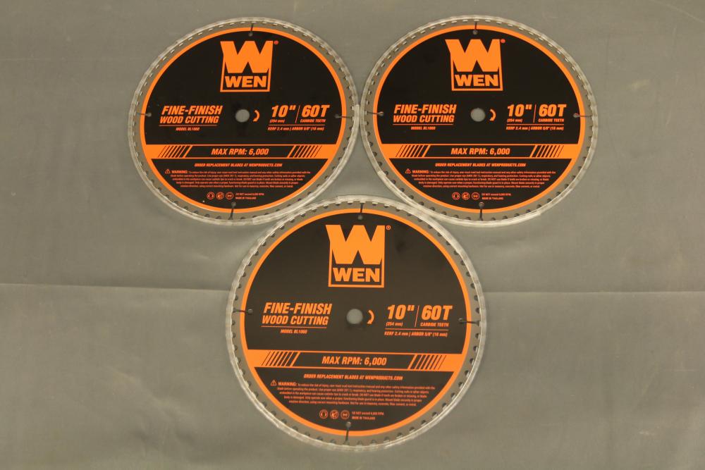 3 WEN 10-Inch 60T Fine-Finish Wood Cutting Blades. Each blade has carbide teeth, a kerf of 2.4 mm, and an arbor size of 5/8 inch (16 mm). The maximum RPM for these blades is 6,000. Model BL1060. Pickup only.