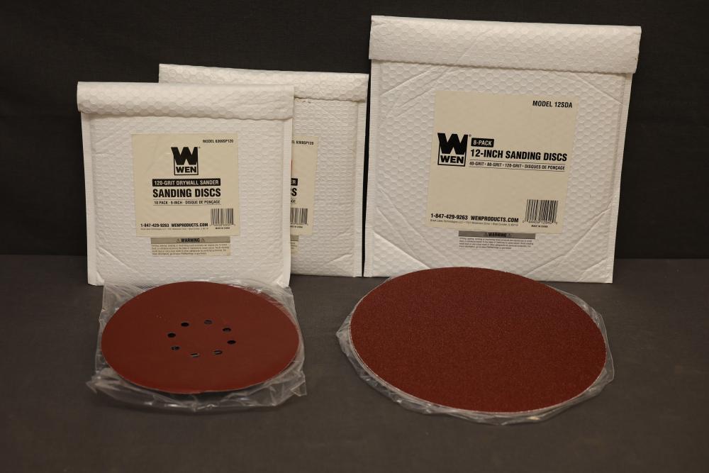 WEN 12-Inch Sanding Discs Model 12SDA and 9-Inch Sanding Discs Model 6369SP120. Includes 8-pack of 12-inch sanding discs in 40-grit, 80-grit, and 120-grit, and 10-pack of 9-inch sanding discs in 120-grit. Pickup only.